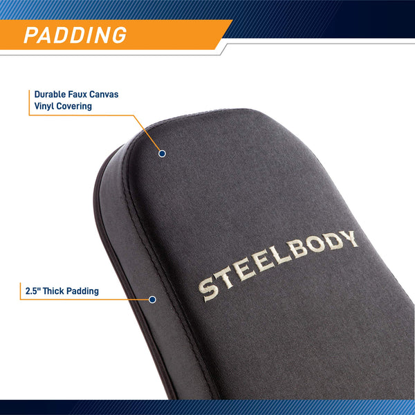 Do you want to gain more powerful arms? Or do you want to achieve a stronger core? What about a broader back? If you want to improve your muscles, you should get a full body workout with the Steelbody deluxe utility bench. This state of the art exercise equipment is specially designed for weight training. It can be used for arm lifting, back training, Ab workouts, and free weight programs. This is ideal for both novice lifters and veteran trainers alike, providing a full body exercise to give you even muscle development. Use this equipment to effectively train arms, shoulders, chest, ABS and back - The optimal distribution of muscle results in a balanced physique. Made of durable stainless steel, this sturdy bench can carry a maximum weight of 300 lbs. It has a 2-inch thick padding with study faux canvas vinyl covering for added comfort and grip. This mechanism has personalized bench pads that can be adjusted into various positions to fit every workout. The back rest pad can be rearranged into six positions - including the military, incline, and flat - while the seat pad can be adjusted into five positions. It has non-marking foot pads and end caps to prevent floor Marking and it has transport wheels and handle for easy storage. It can also be added to any rack or cage system. Attain the Rock-hard muscles that you always wanted and start investing on your body. The Steelbody deluxe utility bench is the first step to this Dream - a wish that would become a reality through hard work and perseverance. This heavy duty utility will support your training, but to achieve your goal, youve got to have the drive, perseverance, and effort. Start WORKING out, now!