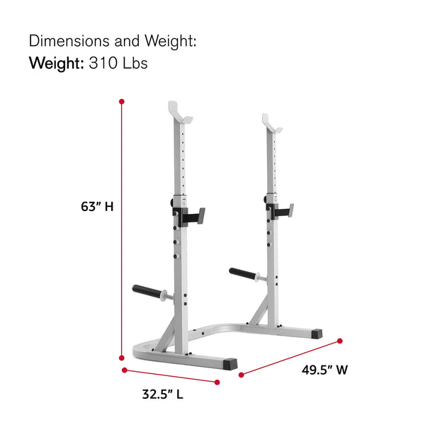 Train Your Entire Body: Take control of your strength-training routine with the Weider Platinum Squat Rack. Forged from durable steel, this squat rack can support up to 310 pounds of Olympic weight, making it a viable option for weightlifters of all experience levels. Perform traditional squats, rack pulls, deadlifts, and a variety of other compound exercises to develop lean muscle across your entire body. Integrated weight plate storage pegs allow you to store and organize your own 2 Olympic weight plates (sold separately) and keep them within reach as you exercise. Adjust both the upright bar holds and safety spotting arms to fit your frame, lifting style, and exercise preferences for a comfortable and secure workout in the comfort of your own home gym. Use with the Weider Platinum Utility Bench (sold separately) to perform chest press and a variety of other combination exercises. Independent Squat Rack: Perform squats, rack pulls, deadlifts, and a variety of other compound exercises with this powerful steel squat rack. Adjustable Spotting Arms: Prioritize your safety, especially when lifting alone. These long spotting arms are designed to adjust to your needs and catch any weight that might slip out of your hands or off of your shoulders mid-set. Adjustable Uprights: Modify the Weider Platinum weight rack to fit your frame, lifting style, and exercise preferences for a comfortable and secure workout in your home gym. 310-Pound User Weight Capacity: This sturdy squat rack is designed to support a heavy load, making it a great option for all of your home workout needs.