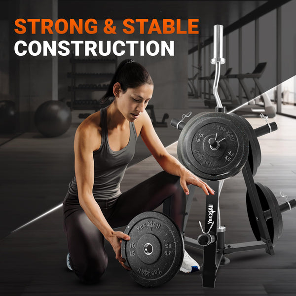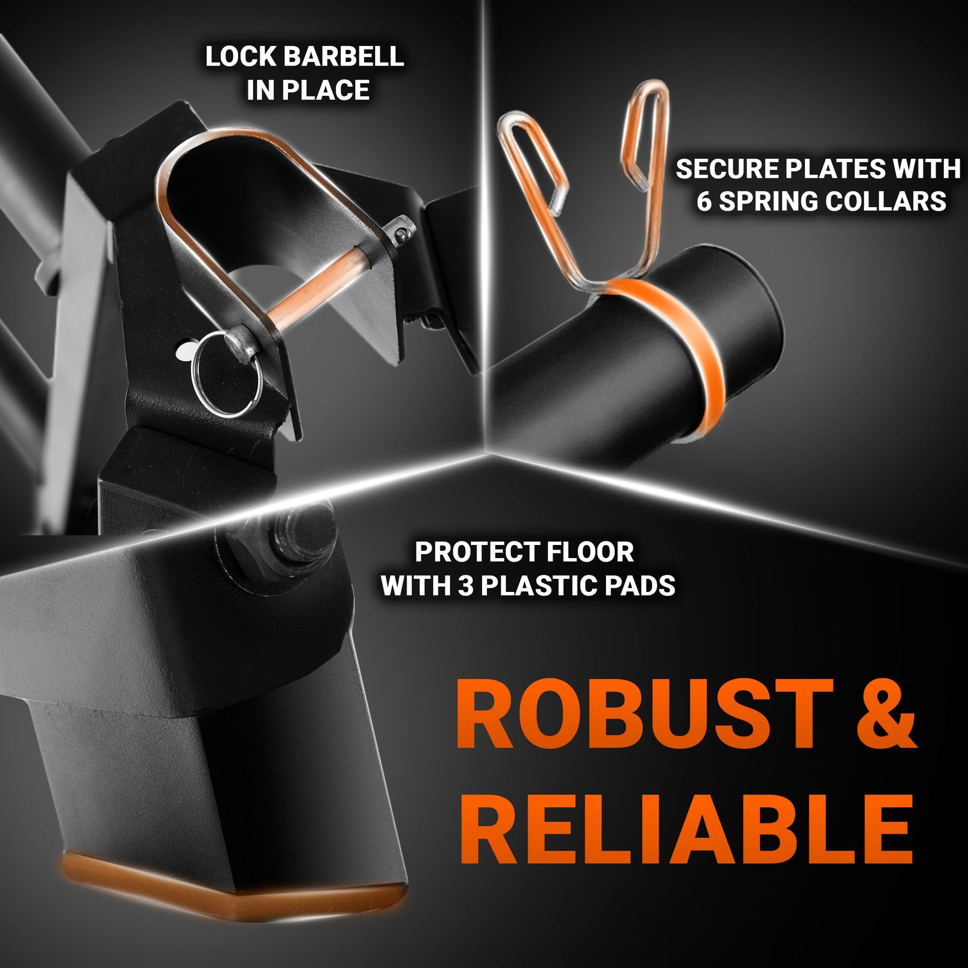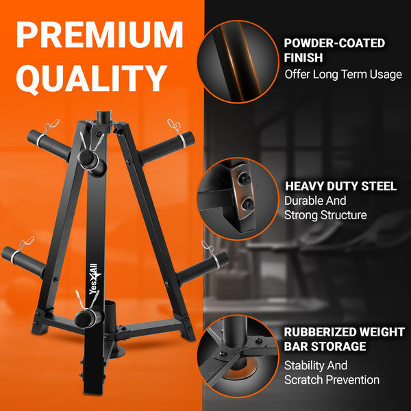 STURDY & DURABLE CONSTRUCTION: Made from heavy-duty steel with a powder-coated finish, barbell weight rack is built to last; Olympic Weight Rack supports up to 350 pounds, ensuring gym equipment stays secure and organized | 2-IN-1 DESIGN STORAGE SOLUTIONS: Featuring 6 pegs with removable adapter sleeves, bumper plate storage rack offers flexible storage for both 2 & 1-inch weight plates; Olympic plate rack & barbell holder also include a hole for a 2-inch weight bar '' | EFFORTLESS ASSEMBLY: Designed for easy setup, multifunctional barbell 2 inch plate rack includes a detailed manual and complete kit, making assembly simple; Our bumper plate holder is ideal for use in home gyms or commercial gyms | STABLE & SECURE DESIGN: Olympic weight plate holder features a triangular support structure, rubberized bar storage, plastic pads for stability and floor protection; Barbell storage includes collars to secure weights and a security pin for the barbell | OPTIMIZE HOME GYM SPACE: This compact olympic weight plate rack 2 inch keeps your gym organized and clutter; The weight tree neatly stores olympic plate storage and barbells, maximizing floor space and enhancing your workout area