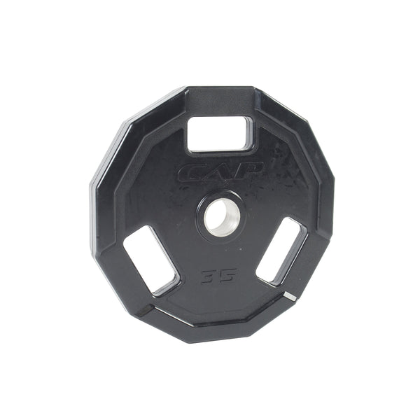 The CAP Barbell 12-Sided Rubber Olympic Grip Weight Plates are one of the best, most essential and flexible gym training equipment used to perform various types of exercise routines. Made of solid cast iron and coated in a black rubber finish ensure a durable product that wont damage your equipment or floors. The 12-sided design prevents the weights from rolling away after setting them down, decreasing the risk of injury. The 3-hole grip design (on 25 lbs and heavier) allows for easy handling when loading and unloading weights. The machined center hole provides a standardized product that will accommodate any Olympic bar (with a 2-inch sleeve diameter). The raised numbers help to easily identify each weight size. Weight plates are versatile and can be used for strength training and endurance training, while also helping to increase flexibility and balance. A single weight plate can also be used for warm-up exercises. These weights are available in 2.5, 5, 10, 25, 35 and 45 lbs. Each weight sold separately.