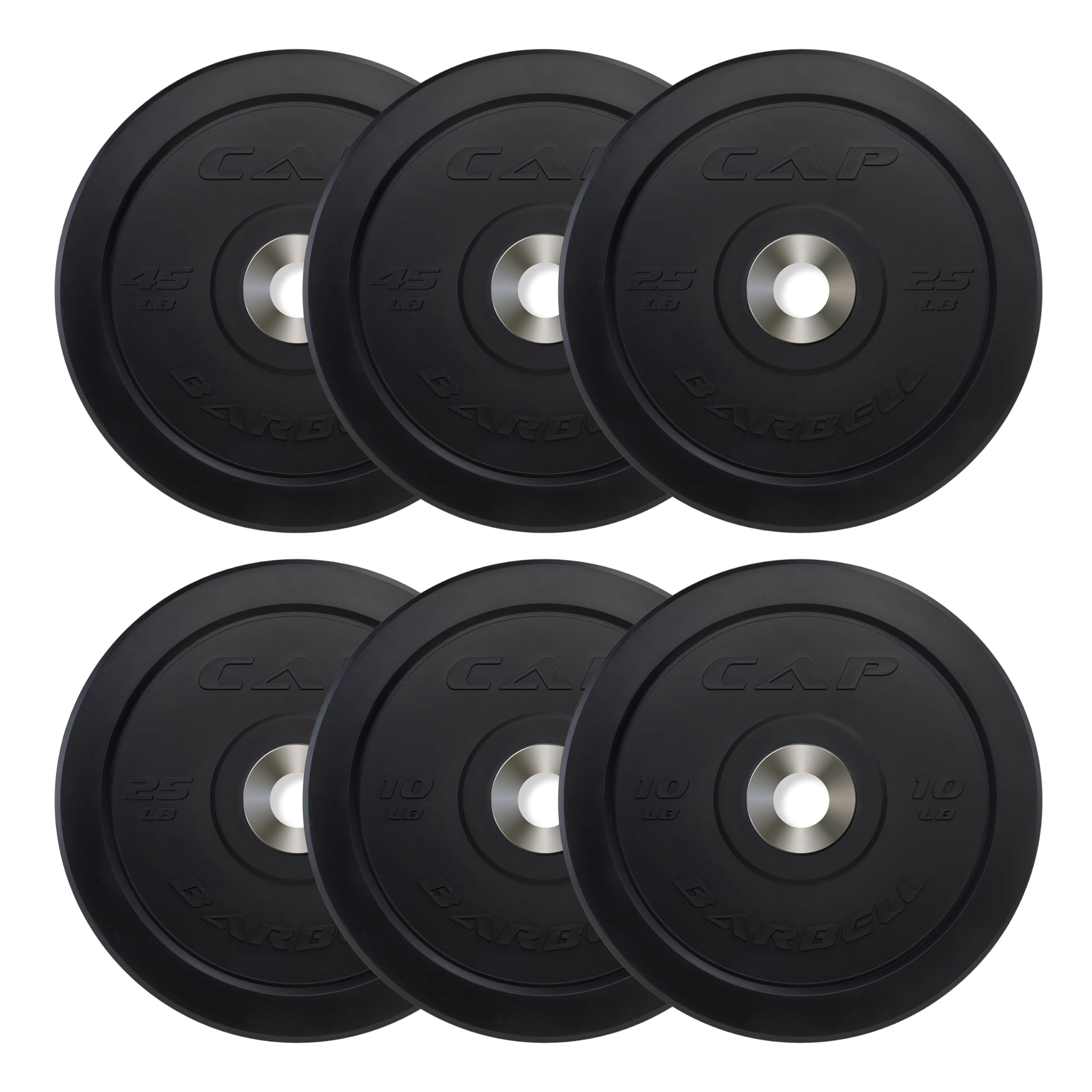 The CAP Barbell PRO Bumper Plate offers protection for both the barbell and the bumper plates with its sound construction. The steel insert hubs reinforce the holes and protect the bar at the same time. This Olympic weight plate set can only be used with Olympic bars (with a 2-inch sleeve diameter). Each weight is made from solid cast iron and coated in virgin and recycled rubber. Adding weights to any fitness routine helps to increase muscle mass while burning more calories and reducing body fat. Add these Olympic bumper plates to your home gym and start experiencing the benefits they can offer to your fitness routine. 30-day manufacturer .