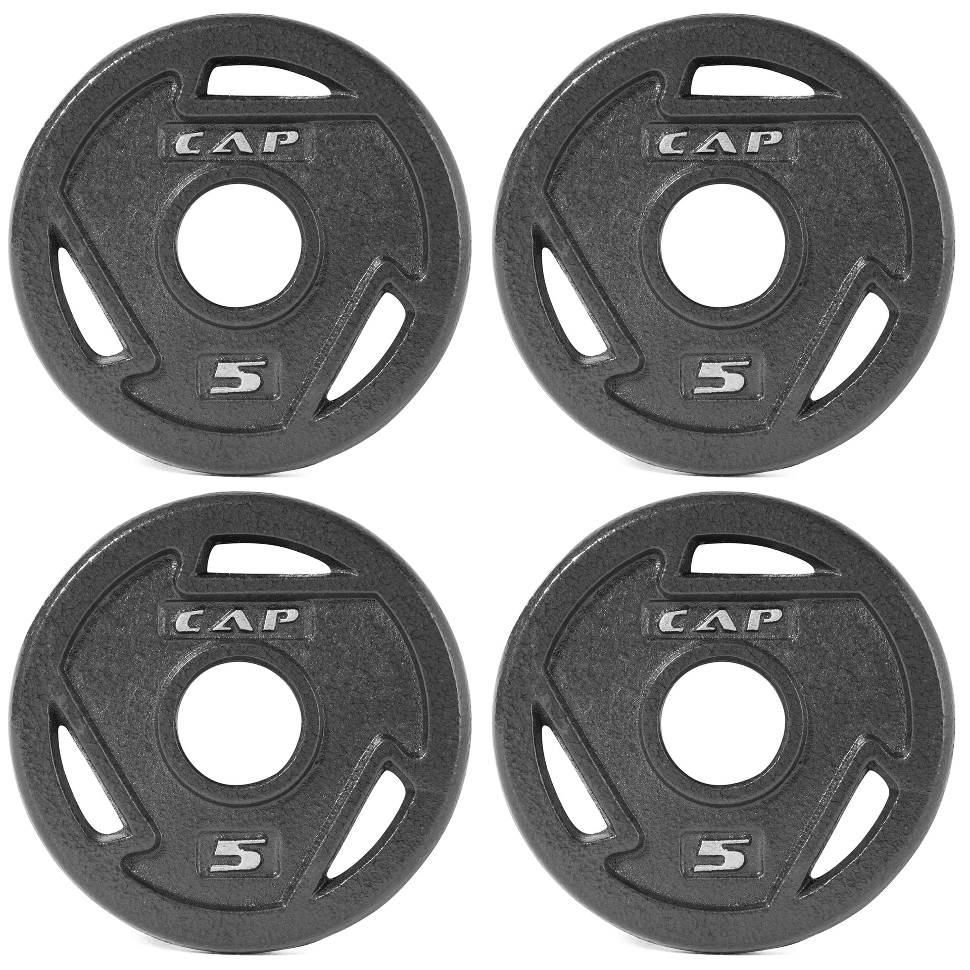 The cAP 2-Inch Olympic grip Weight Plates are one of the best, most essential and flexible gym training equipment used to perform various types of exercise routines Made of solid cast iron and a black baked enamel finish ensure a durable product that wonAt chip or rust The machined 2-inch center hole ensures the weights will fit any Olympic bar with a 2-inch sleeve diameter The raised silver numbers help to easily identify each weight size and the 3-hole grip design allows for easy and safe handling while loading and unloading weights Weight plates are versatile and can be used for strength training and endurance training, while also helping to increase flexibility and balance A single weight plate can also be used for warm-up exercises Includes FOUR 5 LB Olympic weight plates