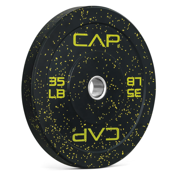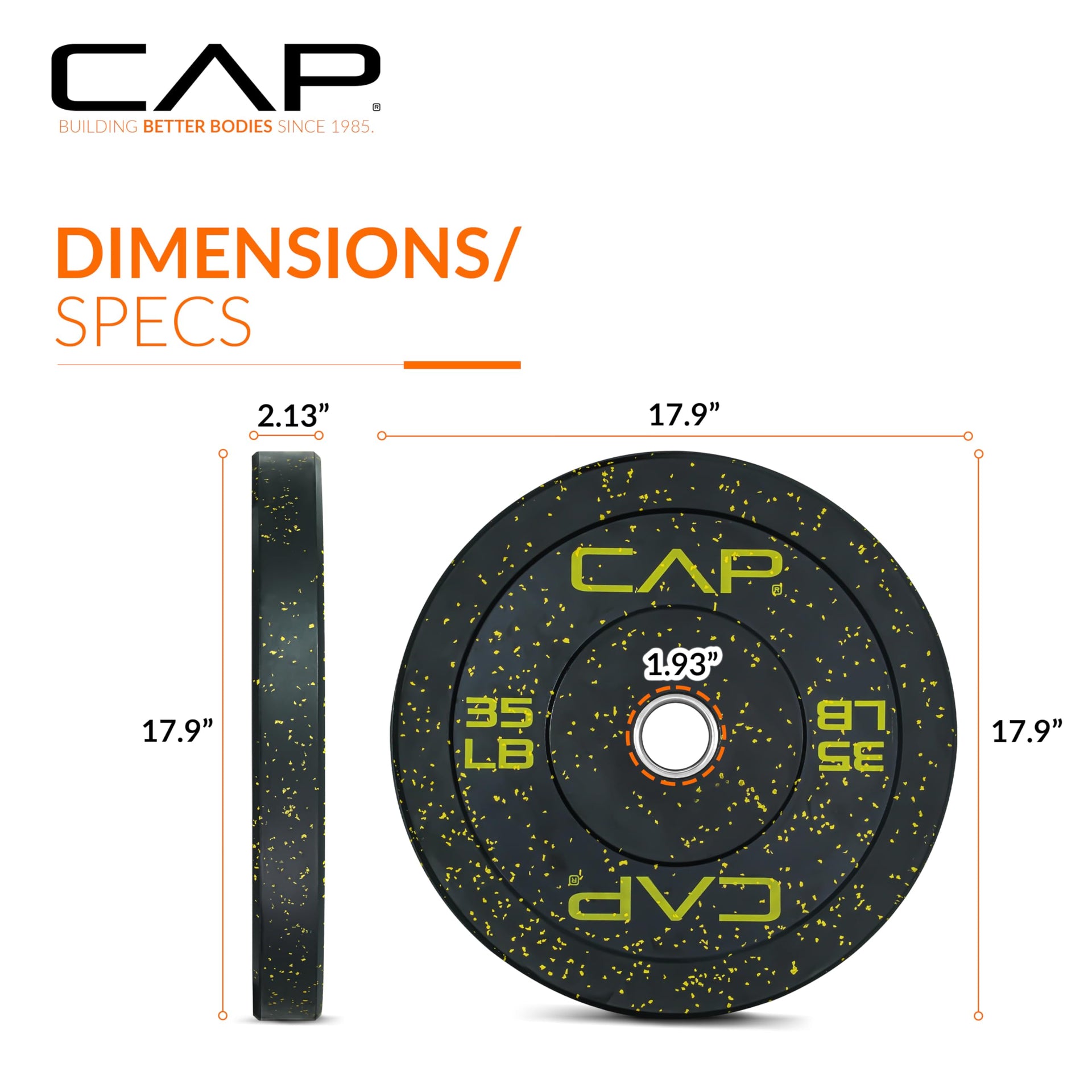 The CAP Barbell Economy - Speckled Bumper Plate with White Logo offers protection for both the barbell and the bumper plates with its sound construction. The steel insert hubs reinforce the holes and protect the bar at the same time. This Olympic weight plate set can only be used with Olympic bars (with a 2-inch sleeve diameter). Each weight is made from solid cast iron and coated in virgin and recycled rubber. Adding weights to any fitness routine helps to increase muscle mass while burning more calories and reducing body fat. Add these Olympic bumper plates to your home gym and start experiencing the benefits they can offer to your fitness routine. 30-day manufacturer .