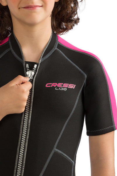 The easy-entry front zipper placement makes the Lido Junior effortless to put on and take off. It is perfect for snorkeling, diving in tropical waters, swimming, surfing and other activities. Highly flexible 2 mm Neoprene and a flattering cut conforms easily to most body shapes for a great fit. The front Zip allows ease of donning and doffing. YKK zipper closure. It protects the body from the UV ray, scratches and jellyfish. The wetsuit should fit adherent, like a second skin, to allow a small amount of water to keeps you warm in the water. Refer to the size chart to get approximately the most suitable size for you. If the purchased size does not dress properly, it is possible to change it. The wetsuit should be worn wet for try it because the neoprene becomes softer. The models for boy and girl have different anatomical cuts for a perfect fit and to ensure free movements. The Lido Jr is designed in Italy by Cressi and made in Asia. Cressi is a brand pioneer in scuba diving, snorkeling and swimming equipment. The product is covered by a 2-year limited warranty.