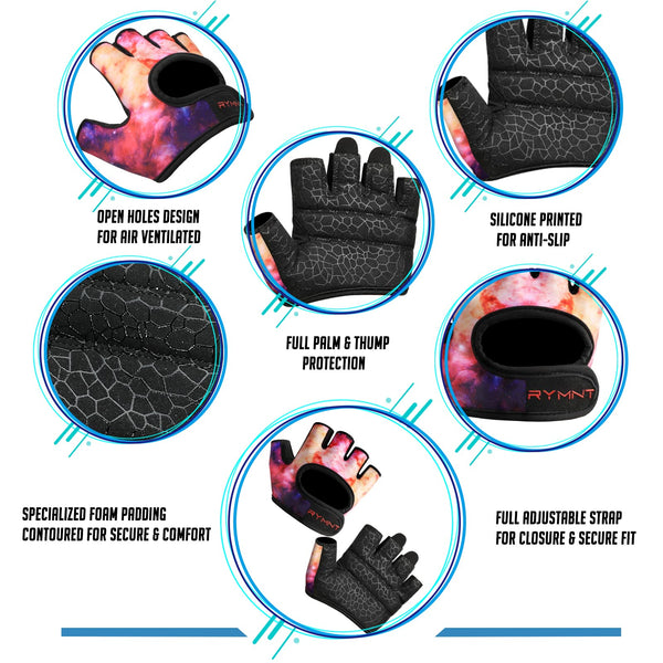 RYMNT Half-Palm Fingerless Workout Gloves - crafted to help you crush every workout with comfort and confidence. Made for lifters, rowers, and fitness enthusiasts, these gloves offer top-notch grip, flexibility, and durability, empowering you to lift heavier, train harder, and keep your hands protected - all in one sleek, high-performance design. Why These Gloves Are Your New Gym Essential Breathable Lycra Fabric: Stay cool and dry with ultra-light, durable Lycra fabric and ventilation holes for maximum airflow - keeping sweaty palms at bay during intense sessions. Precision Padding: Protect your palms with just the right amount of cushioning, designed to enhance grip without the bulk. Ideal for kettlebells, deadlifts, and everything in between, plus easy-off finger tabs for seamless removal. Silicone-Powered Grip: Hold strong through every rep! Full-palm silicone texture amps up your grip without added thickness, perfect for weightlifting, pull-ups, and rowing. Smartwatch-Friendly Design: Keep your fitness tracker close with the low-wrist cut, allowing you to wear your Apple Watch comfortably without interference. Quick Adjustable Straps: Slip them on and off effortlessly with our easy-to-adjust hook-and-loop straps. Secure, snug fit every time for all-day comfort and zero fuss. Minimalist & Lightweight: Lightweight design delivers protection without restricting movement. These are your go-to gloves for functional fitness, fitness, and high-intensity workouts - giving you full wrist mobility. Perfect for: Weightlifting, fitness, Strength Training Deadlifts, Kettlebells, Rowing, Pull-Ups Gym Workouts, Boot Camps, Fitness Classes With these workout gloves, both men and women can experience enhanced performance and superior comfort, keeping focus where it counts: on your training. Get your Half-Palm Fingerless Workout Gloves and elevate your workout game.