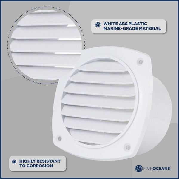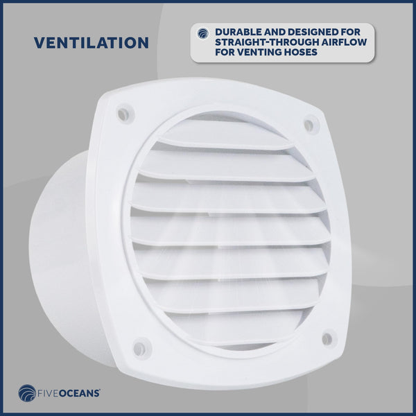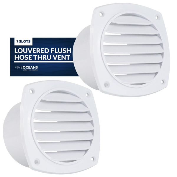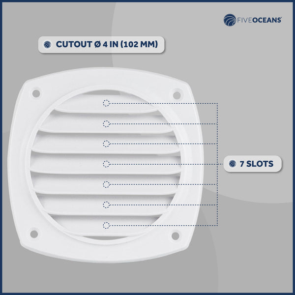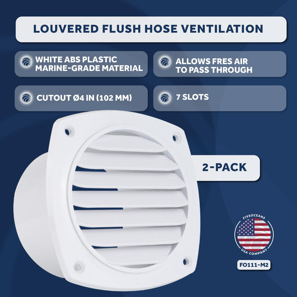 DURABILITY AND CORROSION RESISTANCE: Slotted Louvered Hose vent is made from white ABS Plastic marine-grade material which is highly resistant to corrosion caused by exposure to saltwater and marine environments.MEASUREMENTS: External Size: 4-7/8'' x 4-7/8'' (124 mm x 124mm). Hose Diameter: 4'' (102mm).IMPROVED AIR CIRCULATION: It Promotes better air circulation by allowing fresh air to enter and stale air to exit, reducing condensation buildup, odors, and the risk of moisture-related issues.EASY INSTALLATION: Simple installation methods make this Boat Slotted Vent a convenient choice for boat owners who may want to replace old vents. Mounting hardware: #8 FH screws (not included).MARINE AND BOATING: Slotted louvered vents are used in boats and ships to allow proper air circulation while preventing water intrusion and keeping out unwanted elements like insects and debris.PRODUCT NUMBER: FO-111-M2