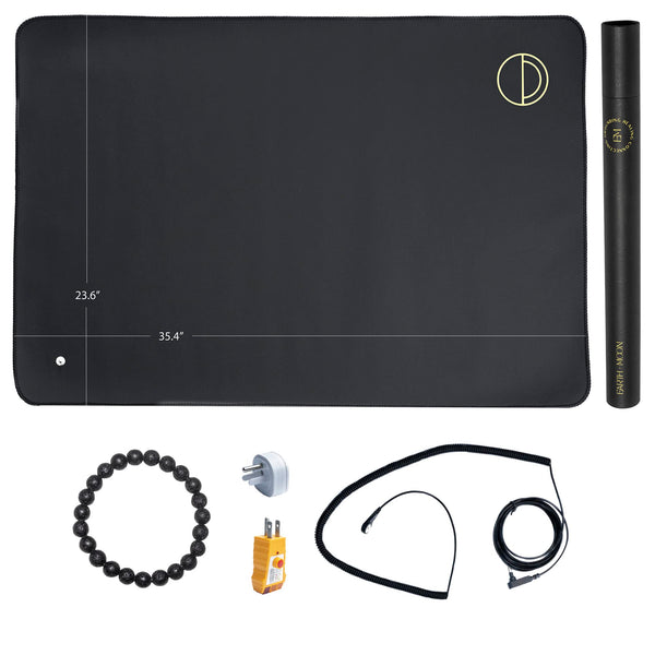 strongEarth and Moon grounding Matstrong give the gift of zen this year Help family and friends achieve their wellness goals Living a busy lifestyle makes it impossible to walk barefoot outside At Earth and Moon, we are on a mission to help you and your loved ones stay balanced and whole one grounding mat at a time strongHow Does An Earth And Moon grounding Mat WorkstrongDesigned to conduct the earthrsquos electrical charge and connect it to your body while sitting, standing or sleeping Using our grounding mats can help you experience these benefits: Feel balanced and centeredStay connected to Earths natural free electronsground from the comfort of your home strongProduct HighlightsstrongHighly conductive grounding matsSafe for adults, seniors, athletes and petsBreathable and no-fray material are used to maximize comfort and durabilityUniversally sized and comes with a long, anti-tangle cord so you can ground wherever, wheneverLightweight and easy to cleanRisk-free purchase We offer a lifetime manufacturer warranty and 90 day return policy for any reason strongHow to UsestrongBring it to work and place on your desk and use as a mouse pad or place it under your desk and let it do its magic while you workPlace under your feet while reading or watching your favorite movie at homeIncorporate into your daily yoga or meditation practice and quickly get into the zoneStand on the mat while doing household choresSleep on it Put the mat under your pillowcase, blanket or sheets and sleep comfortably strongWhatrsquos included:strong2 x grounding mats2 x grounding cords2 x outlet testers2 x protective cases2x bonus lava rock grounding bracelets Find your ground with our Earth and Moon Universal Starter Kit Just click ADD TO cART or BUY NOW