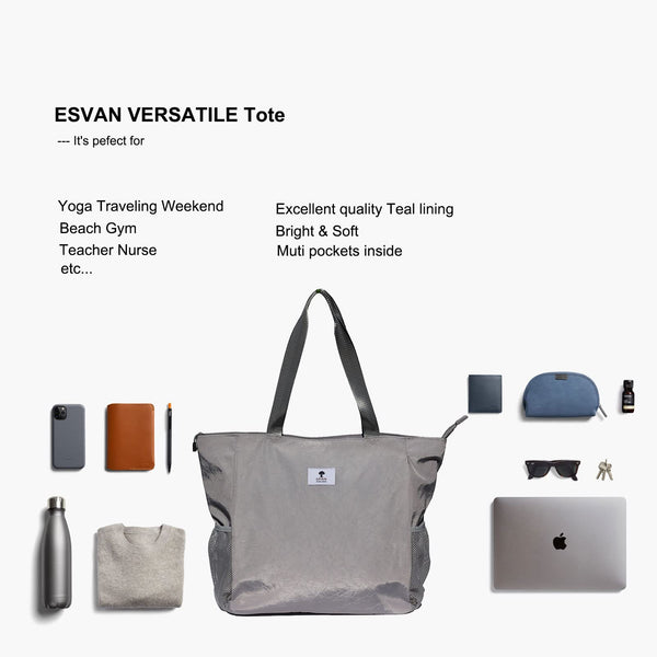 Not Just serve as a Yoga Bag,This tote will meets your all Purpose. Features - Fashion tote for women, perfect for everyday use with all your daily bits. - A great gift choice, it fits for outdoor, travel, shopping, beach, work. - Lightweight & Washable & Waterproof Bags - Handle reinforced with the PU leather,it 's would not be slide off on your shoulder Structure - Gender: Women - Closure Type: Top Full Zipper Washing instructions: - Hand wash with cold or warm water. - Hang to dry. - Washing separately to avoid staining. Package include: - 1 * Tote Bag ONLY Notes: - There maybe some color discrepancy due to screen resolution. - 1-2cm error of measuring due to different measurement methods. - Each bag has been packged in a small bags,please open it and spread the bag,it 's will recover to a good condition. - Each bag has been checked carefully before shipment, but it 's still very hard to guarantee with no extra thread. - It 's great honor that you may talk about ESVAN with your friend,If you really like our bags.? - Any questions, please feel free to contact us and we will resolve as soon as we can.