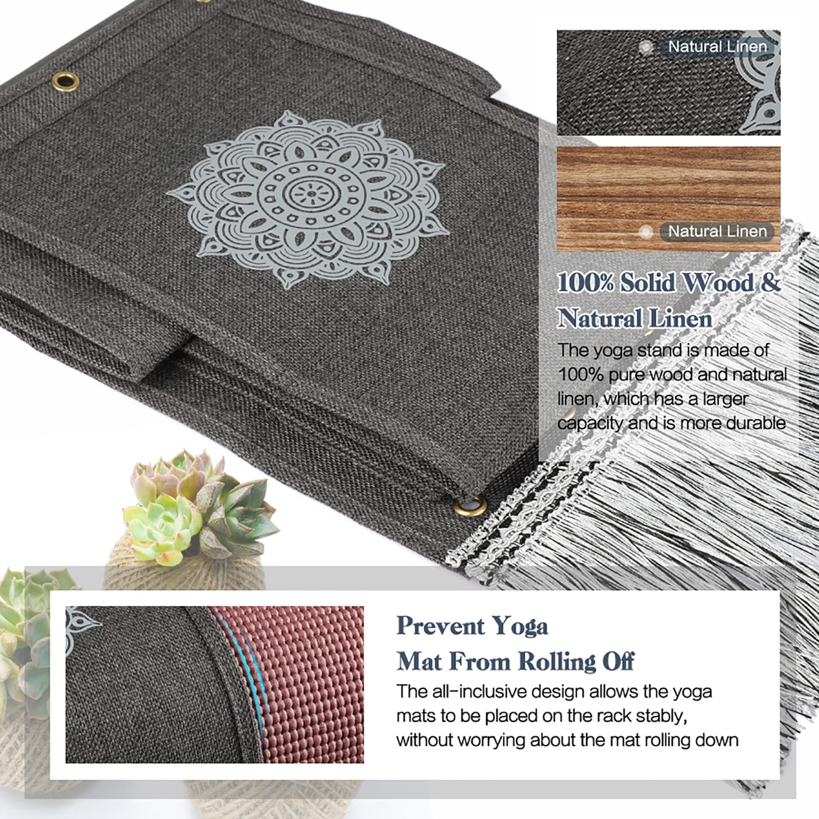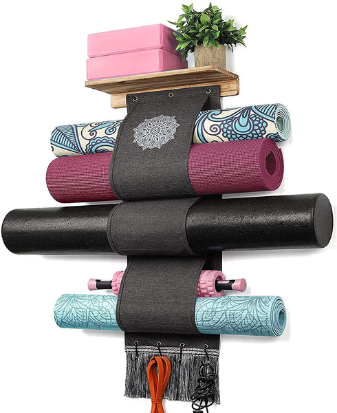 Are You Still Letting Your Yoga Supplies Lay Randomly On The ground choose our yoga mat holder that wont take up your space and solve your organization and storage problems Make your room look neater and more beautiful by storing supplies like yoga mats, yoga blocks, exercise bands, and more Perfectly Storage Rack for Yoga Supplies 3 different size yoga mat storage bags to accommodate different thicknesses and sizes of yoga mats and foam rollers The wooden floating shelves above the yoga mat rack can store your yoga blocks, sports water bottle and other items The mandala pattern and tassel on the yoga mat holder, the decorative effect is better cloth wall mountable yoga mat foam roller holder is the best choice for housewarming and holiday gifting, chic design to decorate gym or room