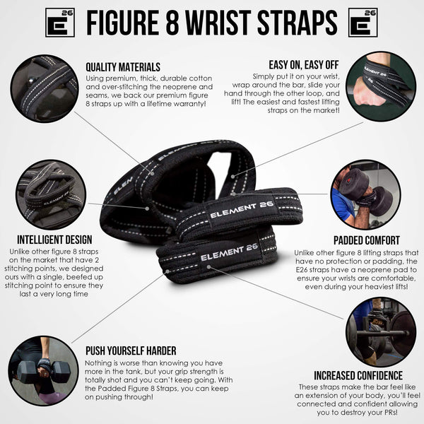 WeAve all been there, bent over in an awkward position with everyone in the gym staring at you while you fiddle and twist trying to get your old, outdated, single cloth wrist straps tight to the deadlift bar They just never seem to want to catch, roll up with equal pressure on both hands, and you end up just abandoning them and lifting less because itAs just not worth it Well, at Element 26, we believe wrist straps shouldnAt be a huge pain in the Introducing the new Element 26 Padded Figure 8 Straps Super easy to get on and off, just place on the bar, slide your hand through, and tighten Once theyAre on, youAll feel the insane amount of connection to the bar that your lifts will instantly improve, YouAll swear the bar has become a part of your body And, unlike other figure 8 straps that dig into your wrists, weAve added a small neoprene layer that makes these feel like wearing gloves