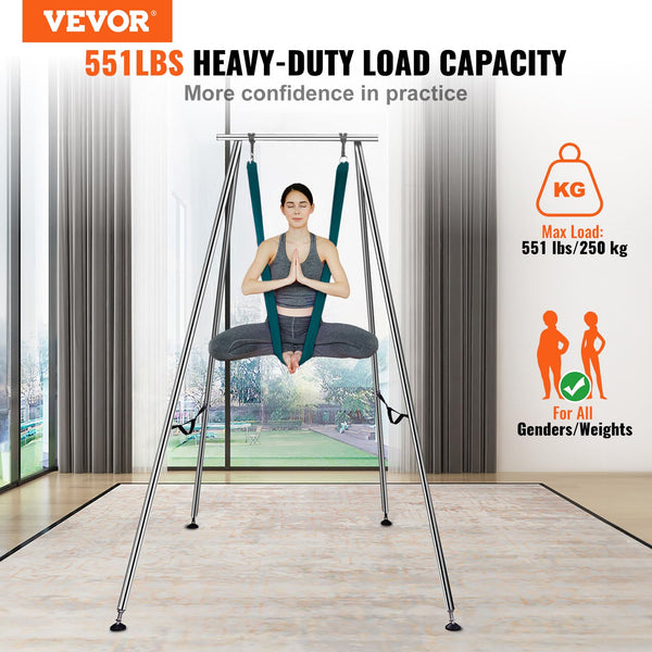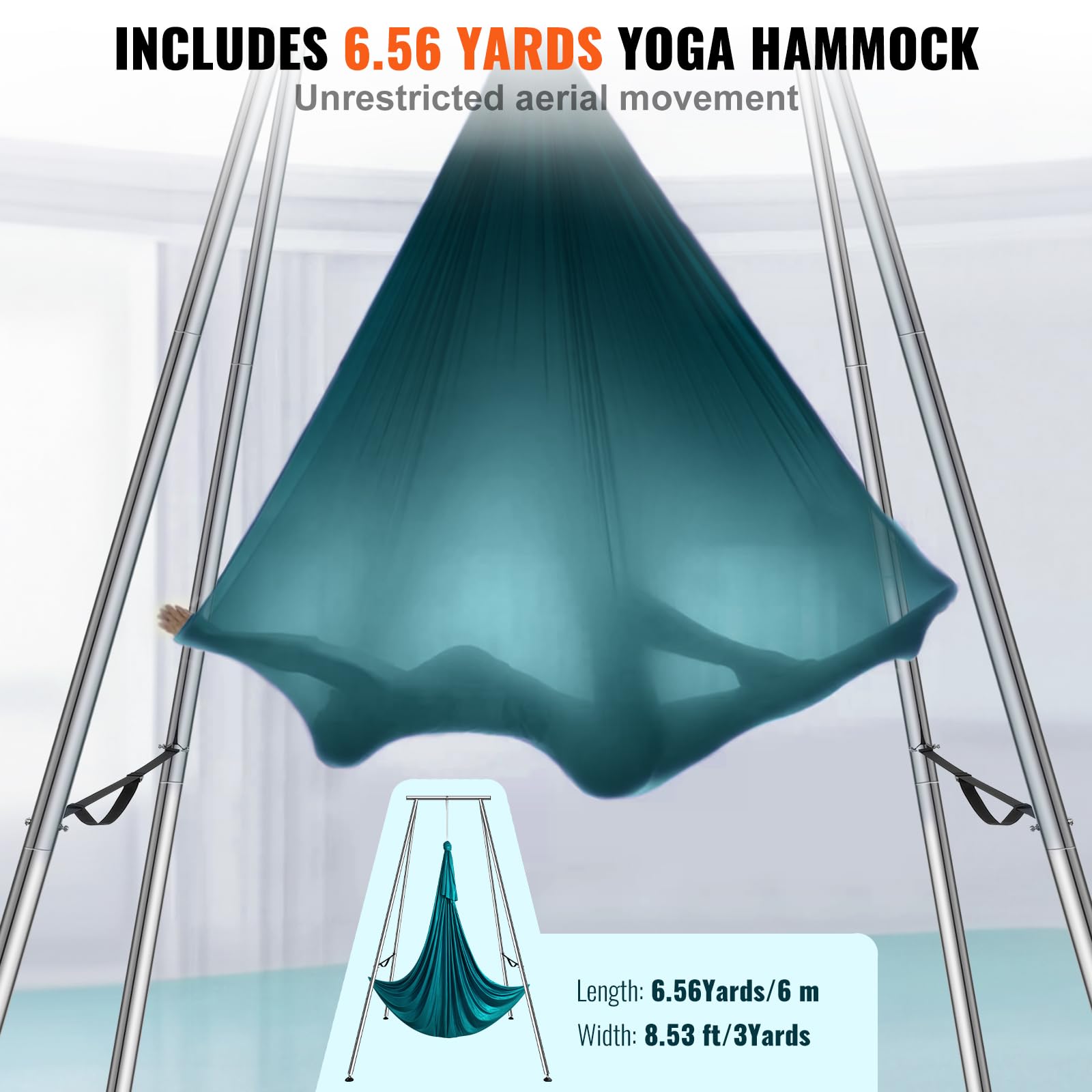 High-Weight Capacity Frame: Our aerial yoga frame boasts a robust F1.8 in/45 mm steel tubing construction. It's surprisingly lightweight but can support an impressive weight of up to 551.15 lbs/250 kg. It provides a secure and stable practice platform for yoga enthusiasts and professionals alike. | Enhanced Rust-Proof Coating: Our yoga swing stand's surface undergoes meticulous chrome plating, not only giving it a shiny and appealing look but also passing level 8+ neutral salt spray tests. This means it's built to withstand rust, ensuring long-lasting durability in various environments. | Spin with Ease: Thanks to its extended length and versatile kit, our aerial silk suits any ceiling height. It's the go-to choice for yoga enthusiasts who enjoy aerial silk workouts. Switch effortlessly between an aerial silk or a playful aerial swing mode. | Double Protection: Our aerial yoga stand frame's clever triangular structure, combined with a non-slip base, ensures stability in all poses. Practice with peace of mind, focusing on your yoga journey without security concerns. | Effortless Assembly: Say goodbye to complicated setups. Our yoga rig features a threaded rotating connection design, making assembly a breeze. Whether you're at home or outdoors, you can start your yoga practice in no time.