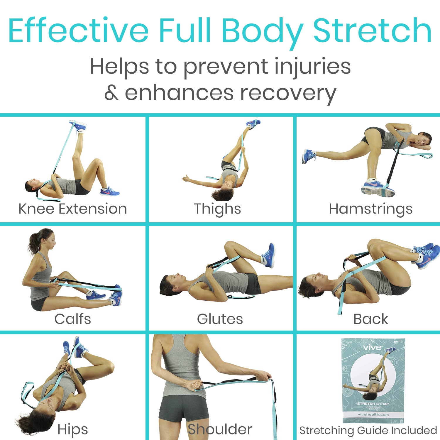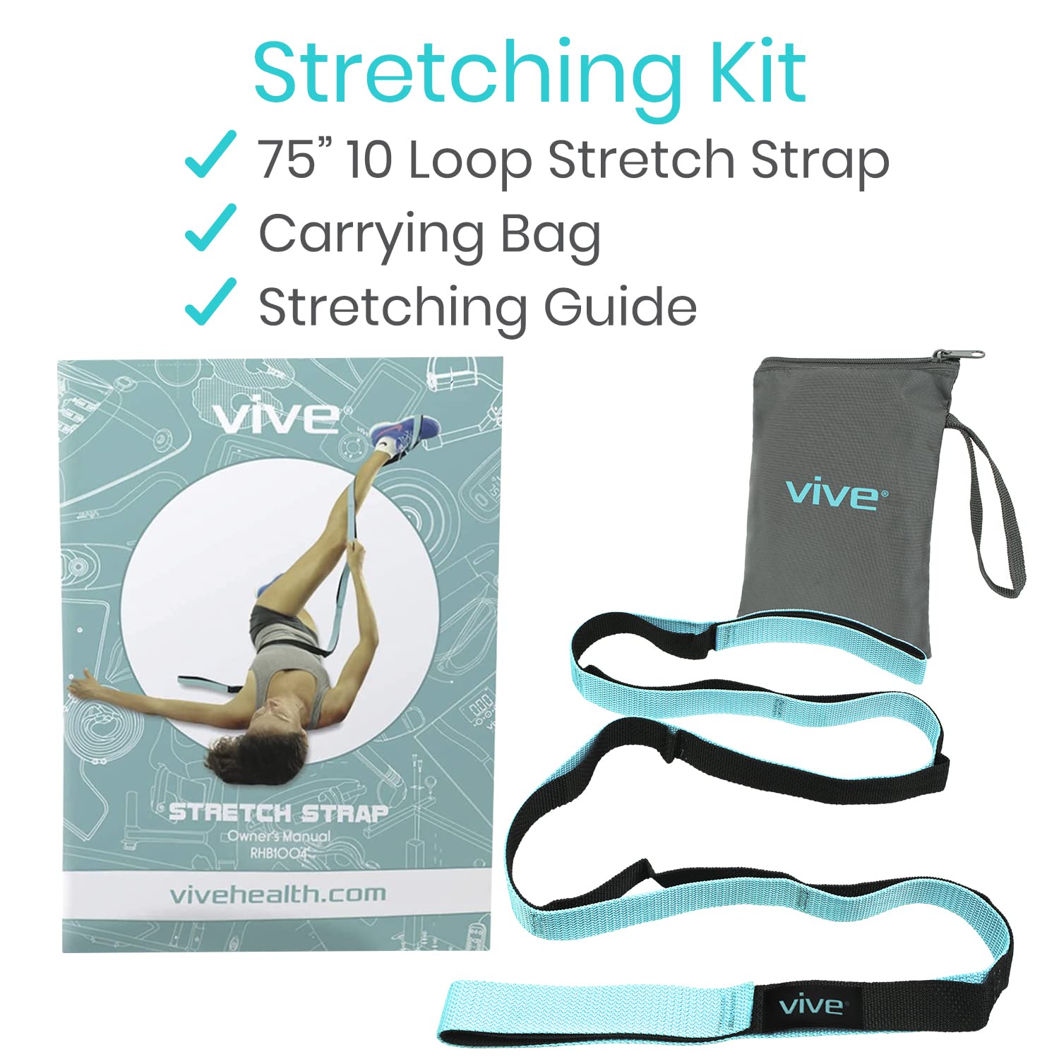 Stretch Strap By Vive The Stretch Strap by Vive is great for anyone looking to improve their flexibility. Anyone pre or post surgery or suffering an injury with hip, shoulder, knee, lower back pain can benefit from using this product by exercising and stretching at home .This stretching band allows people of all sizes and ability to progress whether beginner, intermediate or advanced level. Great for Yoga too Exercise Guide: An exercise guide with easy to understand directions is included with your purchase. Color pictures clearly demonstrate different exercises and stretches that will help you improve your flexibility, strength and dexterity. Stretch Out Safely and Effectively: Extra long stretch strap facilitates a safe and effective full body stretch. Perfect for yoga, Pilates, ballet, CrossFit and physical therapy, warming up with a stretch strap helps to prevent injuries and enhances muscle recovery. Improve Your Flexibility and Range Of Motion: Stretch strap provides additional stability during unassisted stretches and poses. Highly effective for athletes, dancers or for physical therapy, the stretch strap improves flexibility and increases range of motion for better performance while reducing the risk of injury. 10 Shoe Sized Loops Fit All Feet: Ten integrated loops are large enough to accommodate most athletic shoes for ultimate convenience. Loops also provide comfortable handholds the entire length of the strap for stretching to your personal max. Durable Non Stretch Strap: Stretch strap is made with a premium quality woven nylon that will not stretch. The sturdy nylon strap is durably constructed to withstand extensive use. Measuring 75 in length, the stretch strap is also comfortably sized to work for any individual. What's Included: Stretch Strap Exercise Guide