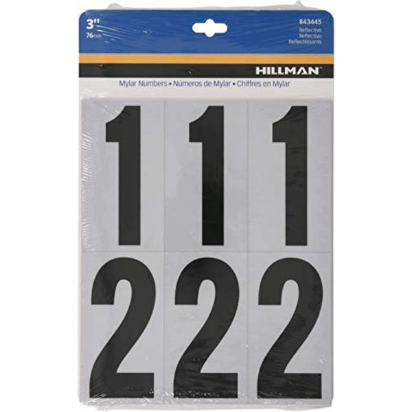 Hillman 843445 Reflective Adhesive Mailbox Number Pack, 3'', Black and White Durable, weather resistant material. Includes: (4) #1, (4) #2, (3) #3, (2) #4, (3) #5, (2) #6, (2) #7, (2) #8, (2) 9, (3) #0.3'' white and silver reflective numbers. Self-adhesive. Durable, weather resistant material , Includes: (4) no.1, (4) no. 2, (3) no. 3, (2) no. 4, (3) no. 5, (2) no. 6, (2) no. 7, (2) no. 8, (2) no. 9, (3) no.0 , 3'' white and silver reflective numbers , Self-adhesive