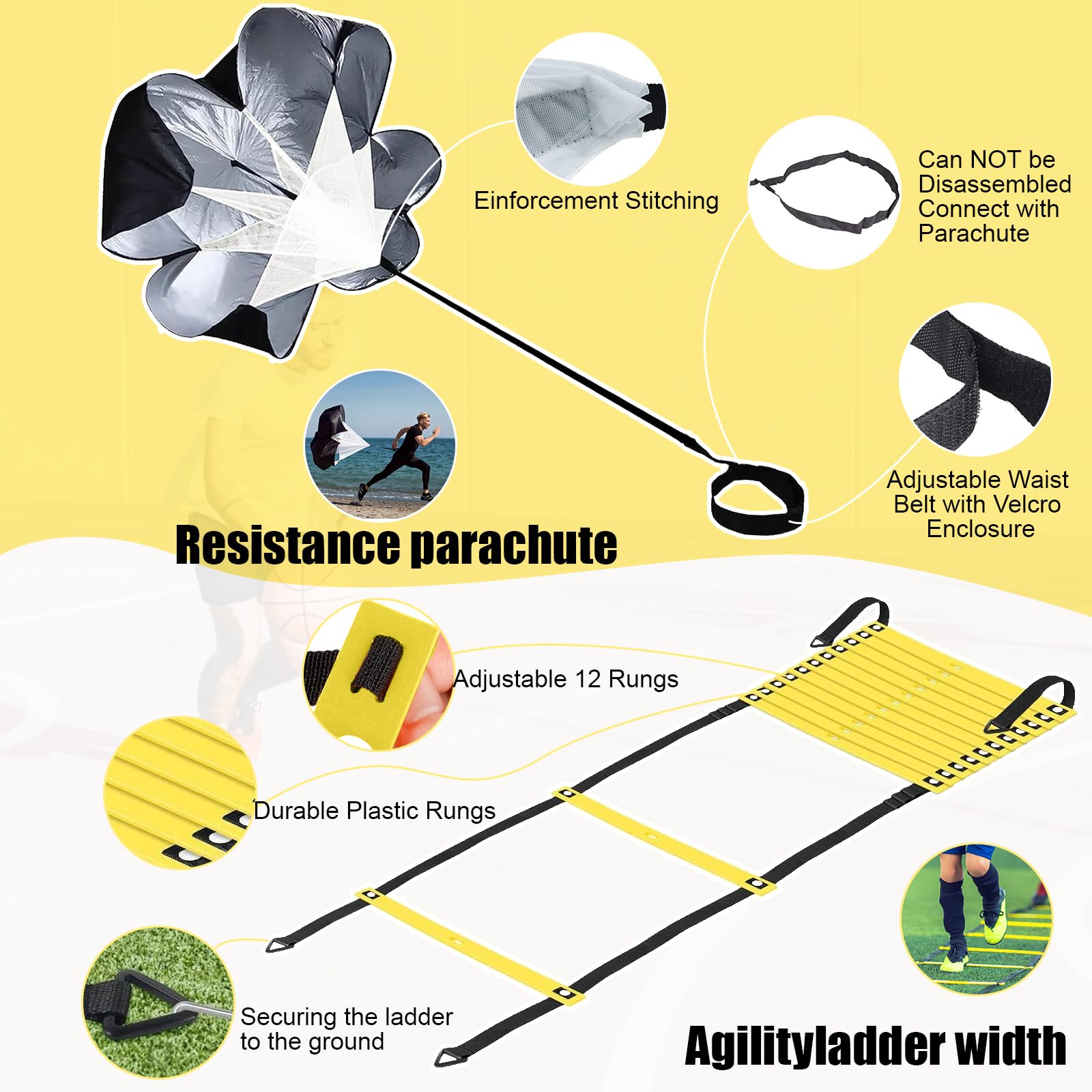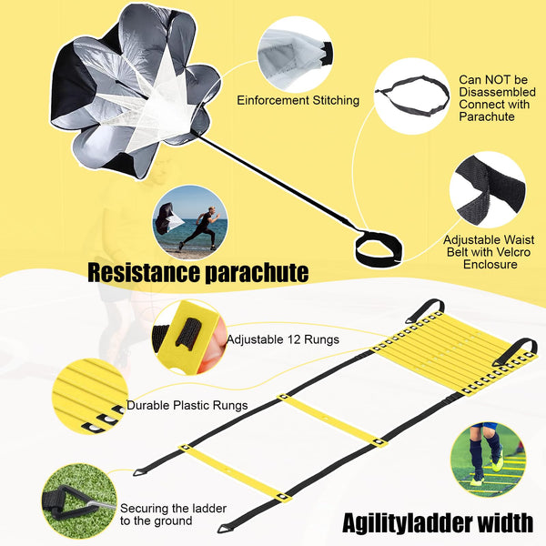 You can take endurance training equipment anywhere, outdoors, indoors and wherever you are. With 7 kinds different types of equipment that target different skills, which is suitable for anyone, at any point in your fitness journey.The perfect athletic workout ladder for most sports: basketball, field hockey, track and field, lacrosse, running, basketball, soccer, soccer training equipment and more.A great way to increase agility, speed, balance, explosiveness, jumping ability, weight loss and total body workout.The Speed Agility Ladder facilitates soccer drills and is essential for improving speed, agility, coordination, quickness and overall athletic performance.Training cones are good for delineating training areas, warm-up exercises, shuttling and rounding exercises.Parachutes are suitable for improving speed, endurance, strength and accelerating parachute release along with overdrive drills.Whether you 're an amateur sports fan or a professional athlete, the perfect soccer agility training gear for teens, athletes, kids, adults, trainers, coaches or beginners.What 's included?1 x Agility ladder1 x Resistance parachute12 x Disc Cones with holder4 x Pegs1 x Jump rope1 x knapsack