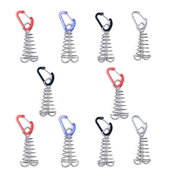 Product Features: - As the stakes for shelter,shade,canopy,blanket,sheet - The deck-peg with carabiners are ideal for camping,hiking,backpacking,picnic - These deck pegs are designed with octopus shape,which create stability better to prevent the ground nail from falling off or rotating due to the fall of the tent.Retractable spring design,can be used on boards of different thicknesses Specifications: Quantity:10pcs Button shape:square Material:aluminum alloy+ stainless steel Color:silver deck anchor pegs+D shape carabiners(random color ) Size:please refer to the size in the image Package included: 10pcs Tent Stakes and D shape carabiners