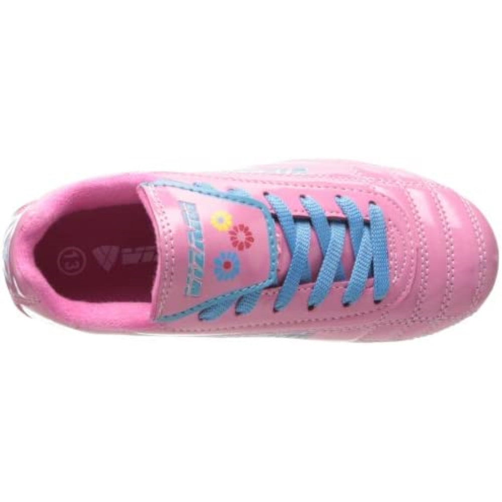 Ans: The upper of the Vizari Blossom Firm Ground Soccer Shoes features unique flower graphics on a durable, synthetic leather material.