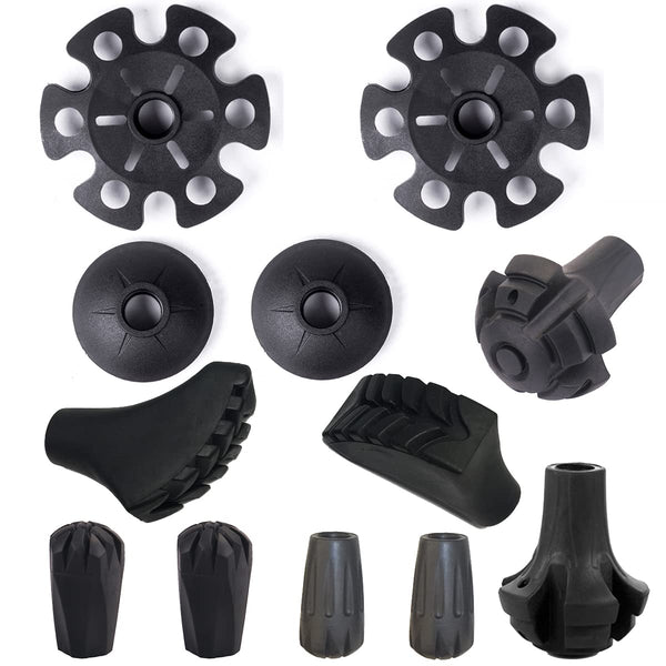 - Q: What accessories are included in the Diooid replacement tips set? A: The Diooid General Accessories set includes a total of 12 items: two snow baskets, two mud baskets, two large shock-absorbing paws, two large shock-absorbing foot tips, and four traction walking tips.