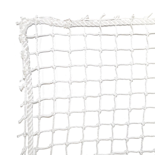 This commercial grade netting from Dynamax Sports is made from the durable No.18 Twisted Knotted Nylon netting. It is UV and weather treated to last year round indoors or outdoors. The 3/4'' square mesh will stop high impact balls from passing through including those hit by drivers. Each net will be reinforced with a 1/4'' rope border with a spring clip at each corner.