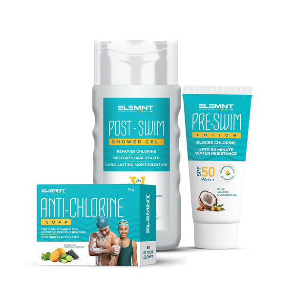 Complete Swim Skincare Combo For Swimmers Protection From Chlorine And Other Chemicals While Alos Nourishing Your Skin And Hair After Swomming Pre Swim Elemnt Pre Swim Lotion Is Formulated To Help Block The Absorption Of Chlorine And Bromine Into Skin During Swimming, Aqua Therapy, Hot Tub Use, And Other Related Activities.Pre Swim Lotion Helps Prevent Drying, Itching, Chlorine Odour And Swimming Pool Rash.Elemnt Pre-Swim Lotion Is Suitable For All Ages And Swimming Levels. It Is Fda Approved, Kids-Friendly & Contains No Harmful Chemicals. Post Swim Body Wash From Elemnt Is Specially Formulated To Deeply Cleanse Your Skin While Protecting Against Chlorine, Sweat And Other Odours After Swimming. Its Nourishing Formula With Tea Tree Oil, Aloe Vera Gel, Vitamin E, Lotus Extracts Works To Soothe And Hydrate Skin After Exposure To Chlorine. Use It After Swimming And YouLl Notice A Remarkable Difference In The Way Your Skin Feels - Soft, Smooth And Refreshed Without Any Lingering Smells. It Efficiently Washes Away Chlorine And Odours For A Pleasant Post Swim Experience While Keeping Skin Protected. A Perfect Combo Product For Your Pre And Post Pool Care Routine.