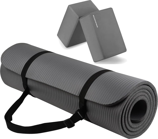 The Fitvids high-density foam mat 1/2 inch thick provides firm cushioning for joints during yoga or floor workouts. It includes a durable, tear-resistant surface, a convenient carrying strap, and two yoga blocks to support posture. Color: Gray.