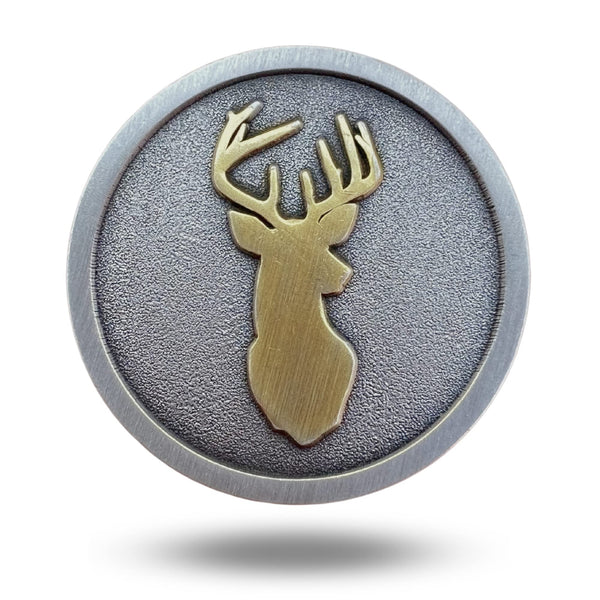All metal, magnetic Trophy Buck Deer golf ball marker measuring 24mm in diameter by 2mm thick. The ball marker is about the size of a quarter and is brand new.