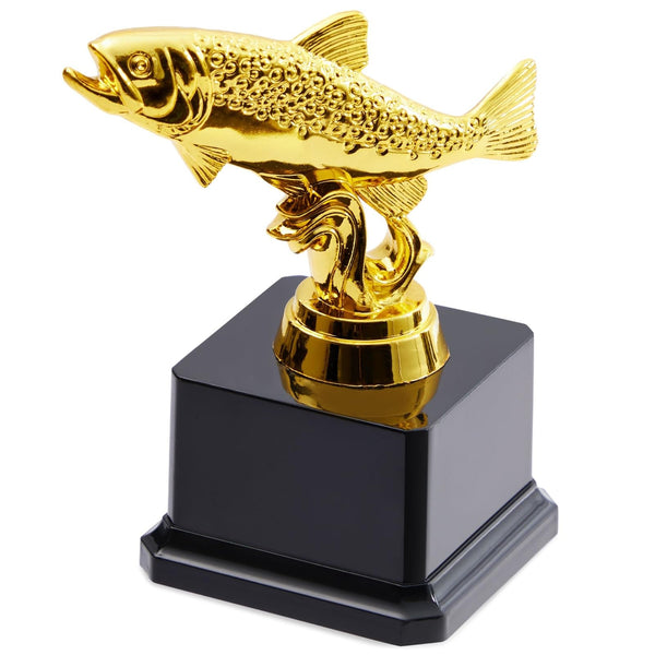 Reward your winners for their catch of the day with this fishing trophy as a symbol of success representing all the hard work put into an endeavor The small trophy features a golden fish atop a black pedestal base that you can display on your office desk, coffee table, or trophy shelf for all to see The fish award trophy can be used for multiple competitions, fishing tournaments, and derbies to reward excellent performance It also makes a funny gag gift for secret Santa This gold trophy makes an excellent competition reward for people of all ages