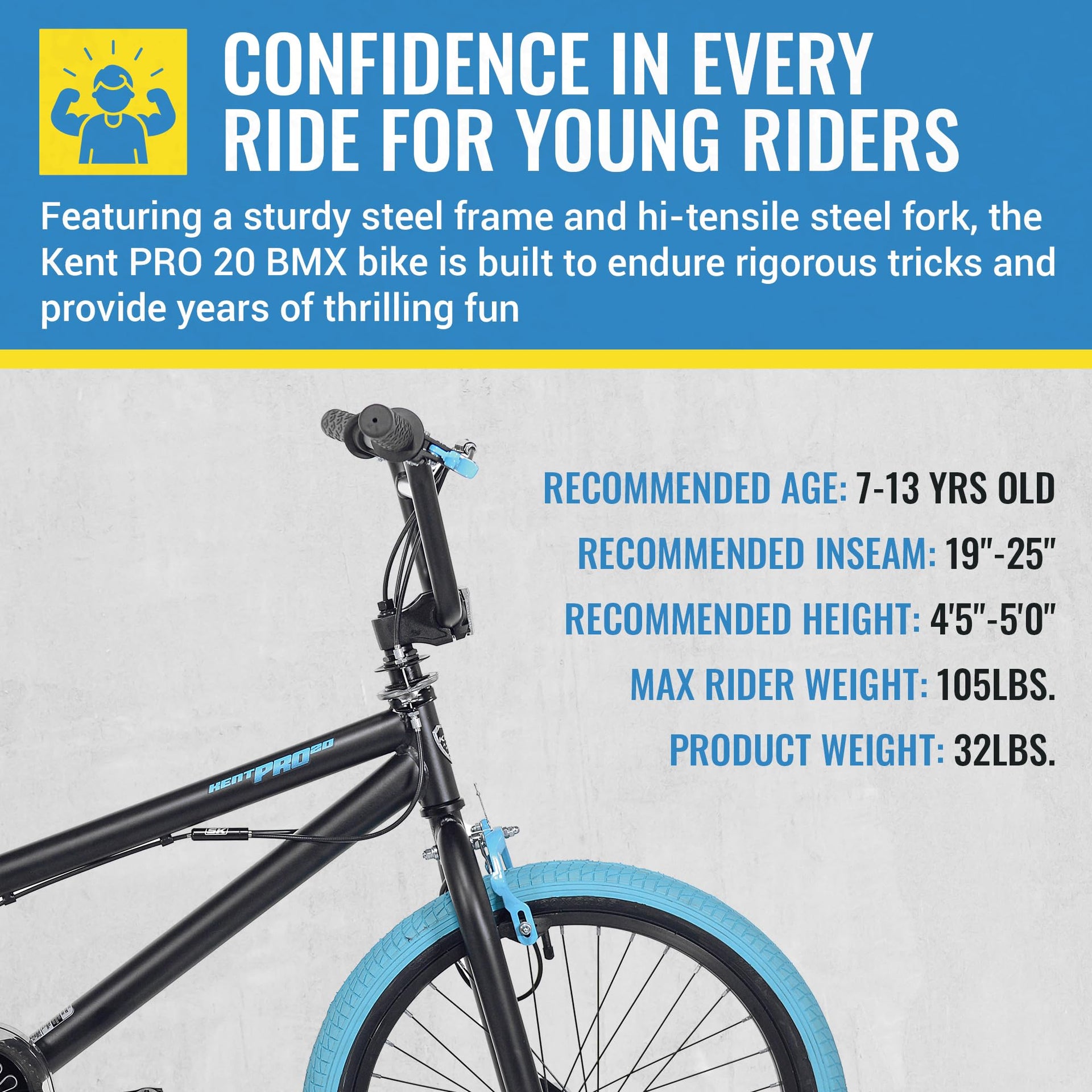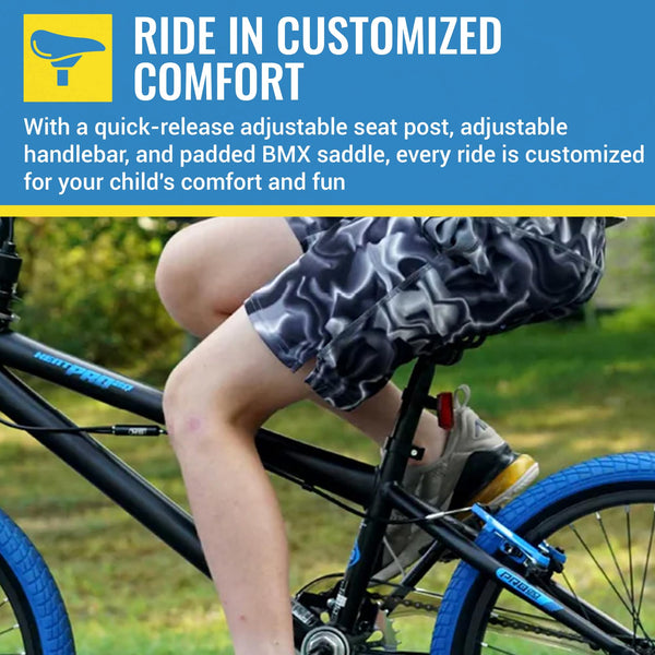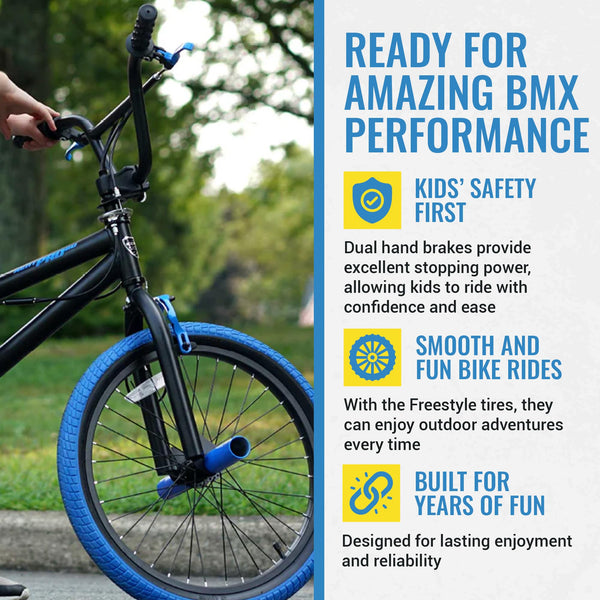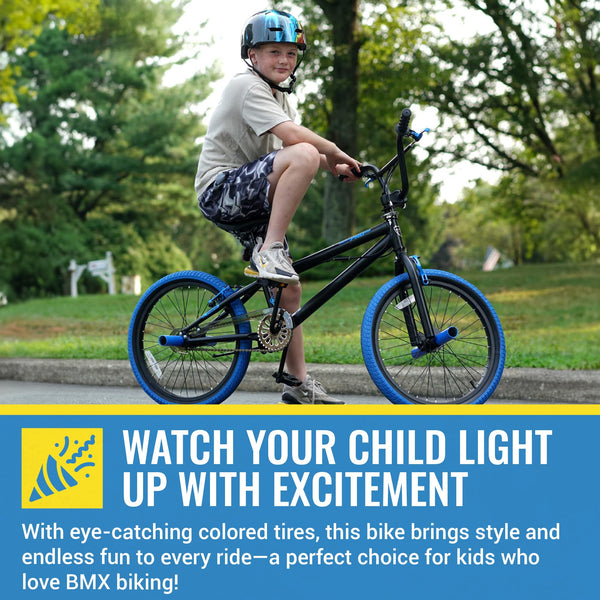 Shred in style with the Kent PRO 20 BMX bike! This 20 inch BMX Bike Pro 20 is a rugged yet stylish bike, featuring a sturdy steel frame and eye-catching colored tires. Safety is prioritized with dual hand brakes and freestyle tires for smooth rides on any terrain. The adjustable seat and handlebars cater to growing riders, while front and rear pegs enhance style and functionality. Ideal for ages 7-13, these BMX bikes are perfect for both trail adventures and neighborhood cruising.