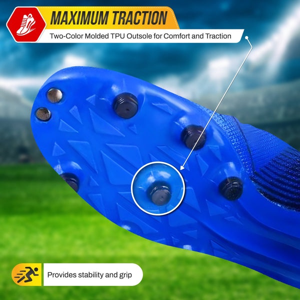 Ans: The cleat features a two-color molded TPU outsole for comfort, traction, and durability.
