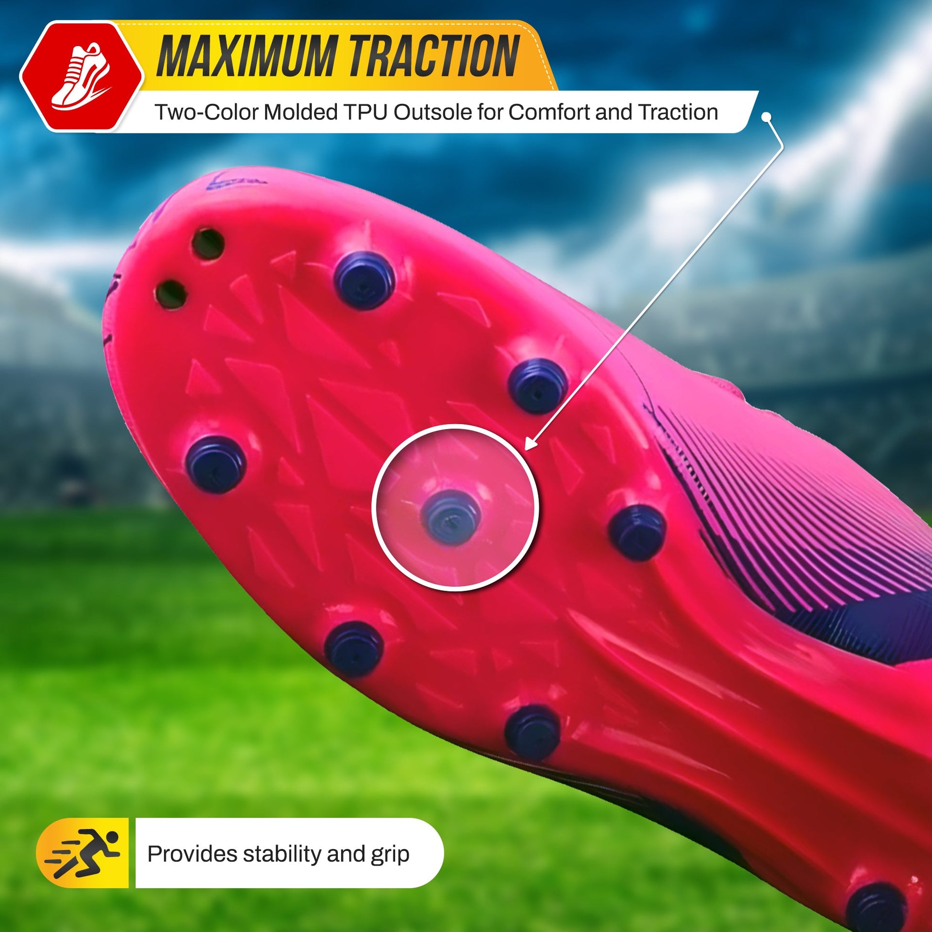 Ans: The cleat features a two-color molded TPU outsole for comfort, traction, and durability.