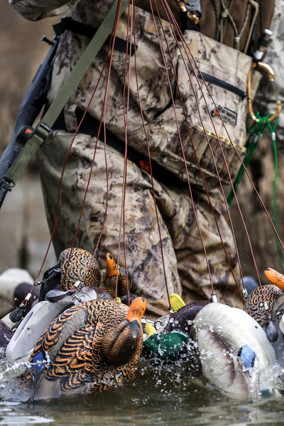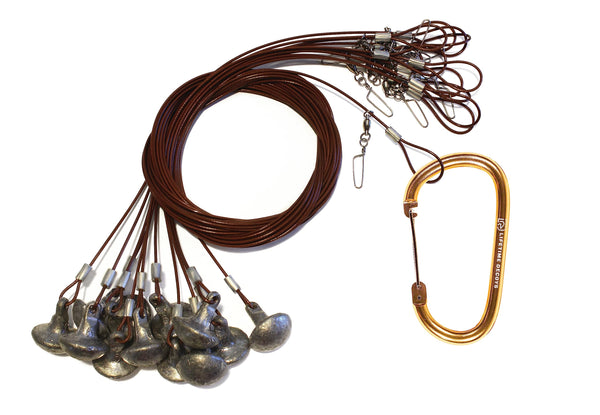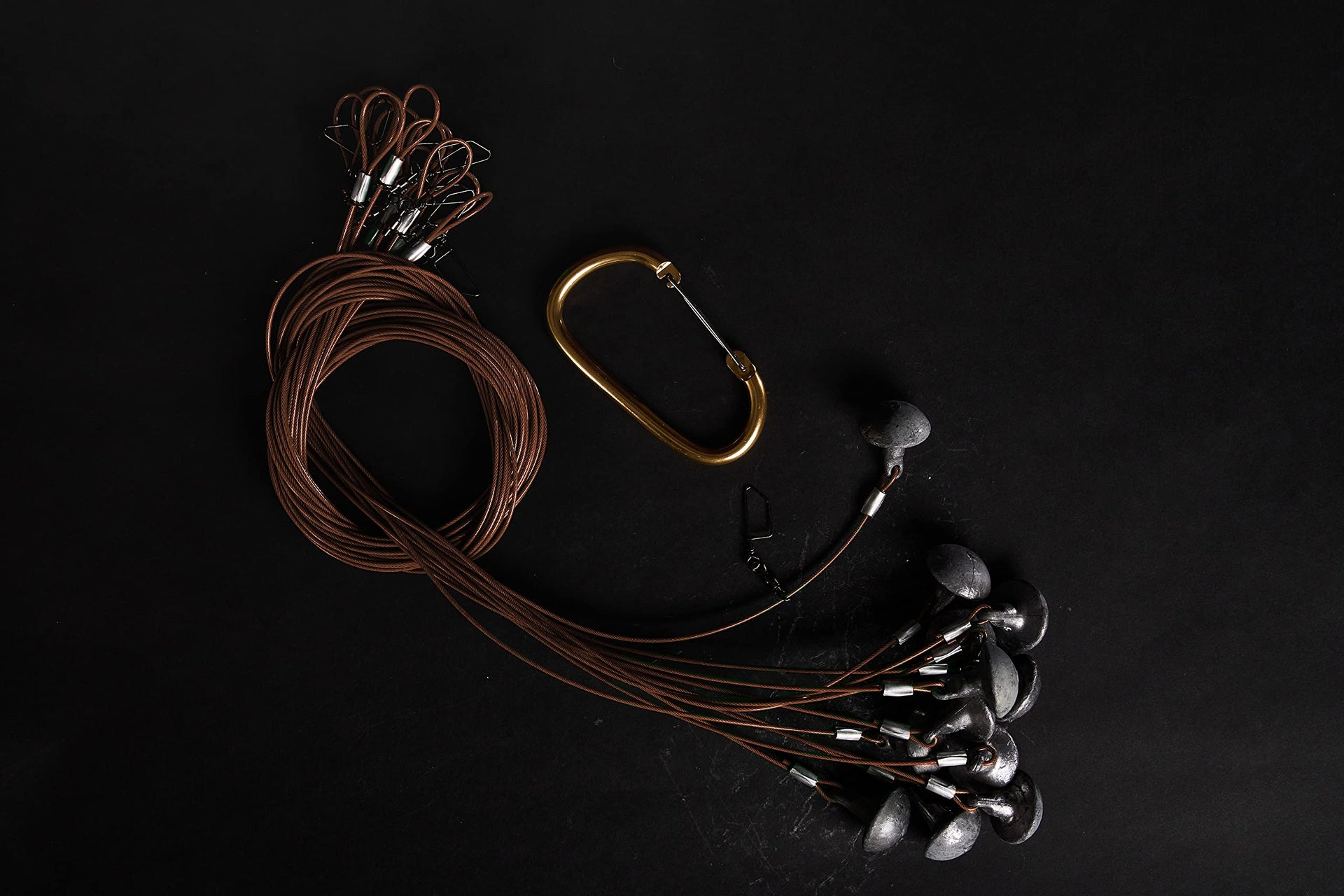 The 6 6oz mushroom weight configuration provides more grip to the bottom, making this the go to rig when hunting medium current or wind in deeper waters. This rig is also ideally suited for use with goose floaters in low current situations. Includes 12 complete rigs, 1 HangAll Carabiner, and mesh bag. Lifetime PVC Coated Steel Cable Ultra-resistant to memory, tangles, and rust Will not break in cold weather 3/32 diameter DryHand Carabiner Loops Keeps your hands dry Makes for the fastest decoy deployment and retrieval process possible Rig design presents the carabiner loop at the top of the decoy every time NeverLoose Crimps Hydraulically pressed aluminum crimps hold no matter the conditions or how hard you throw them HoldFast Swivel Clips Heavy-duty stainless-steel swivel clips are easy to attach, and will hold in place for as long as you own them. AnchorPoint Weights Cast lead weights offered in a variety of sizes and shapes ensure the perfect configuration for every condition HangAll Carabiner Oversized 5 aluminum carabiner will hold as many decoys as you care to carry, and most anything else needed in the field.
