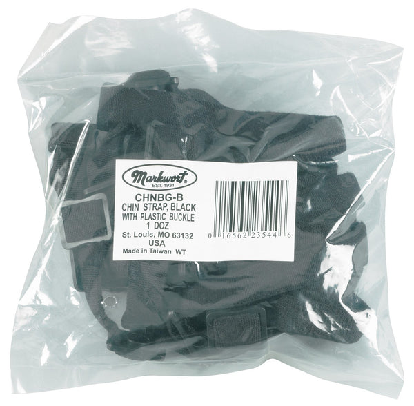 Markwort Chin Strap with plastic buckles. Comes in pack of one d ounces chin straps per poly bag. Plastic buckle. All straps in bag are black. Fits most helmet models.