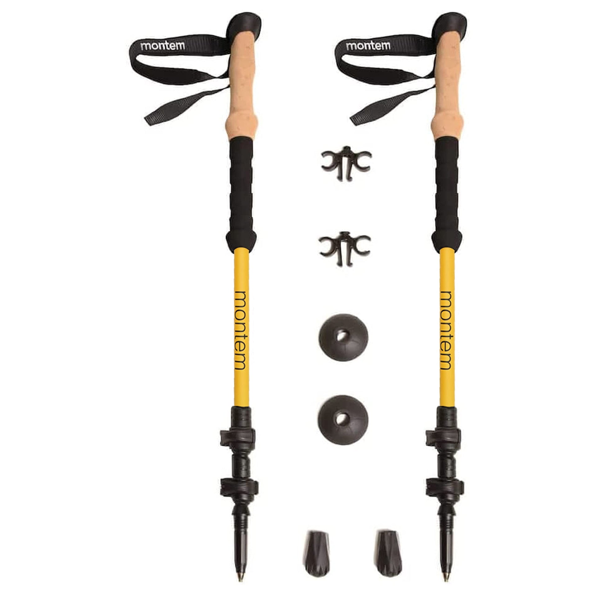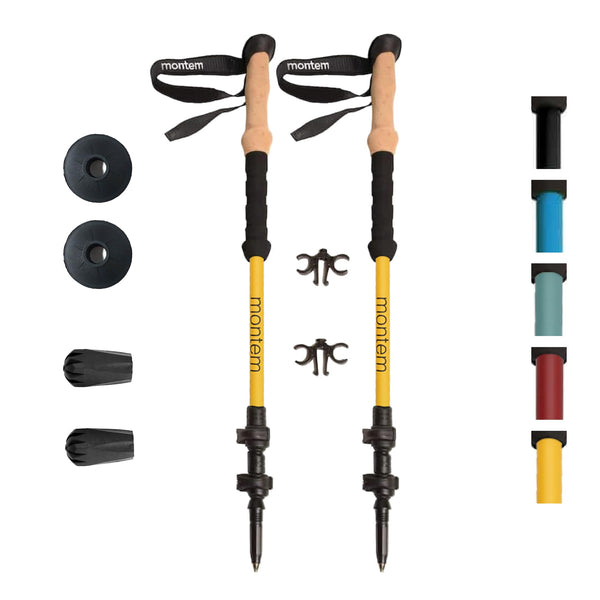 Included will be one set of Montem Trekking Poles (2 poles per set), replaceable rubber tips, a clip to keep the poles together, and a free set of mud baskets!The Ultra Light Carbon Trekking Poles combine their 100% carbon telescoping shafts with the ultra light weight of 7.6 oz per pole for easy, strong, and light use. Specifications:Shaft Construction: 100% Carbon FiberGrip Material: EVA FoamAdjustable: YesUltra Light: YesMaximum Length (in.): 53 inchesMinimum Length (in.): 24 inchesMaximum Length (cm): 135 centimetersMinimum Length (cm): 61 centimetersWeight: 7.6oz per poleGender: UnisexWhen youre out on a journey size matters. You dont want items that are cumbersome. You need strong and you need compact. You need a set of hiking poles to take some burden off of your joints. Hikes can be very tiring, and also incredibly taxing on your body - specifically the ligaments and joints in your knees. Trekking poles are exceptional for helping you on your journey. Montem's carbon hiking poles are perfect for you and do something most others dont by closing down into a compact size with a light weight making it easy to carry. Theyre ultralight, sturdy, and great for traveling.These telescoping poles are perfect for hiking, backpacking, walking, nordic walking, mountaineering, snowshoeing, climbing, and all adventure travel! Hiking poles arent just for hikers and adventurers. That fun family trip can be a bit tiring. The blocks of walking and sightseeing really add up, so make sure youve got a set of walking sticks to ease the burden on your joints while making sure you keep up with everyone else!BUY YOUR SET NOW!