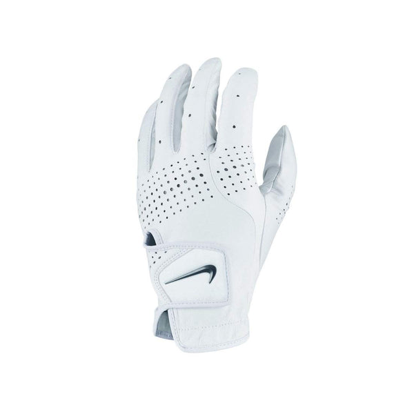 The Nike Tour Classic 3 Golf Glove offers breathability and a soft touch with perforated fingers and supple cabretta leather. Stretch zones provide natural flexibility on the course. Shown: Pearl White/Pearl White/Black Style: N1000499-284