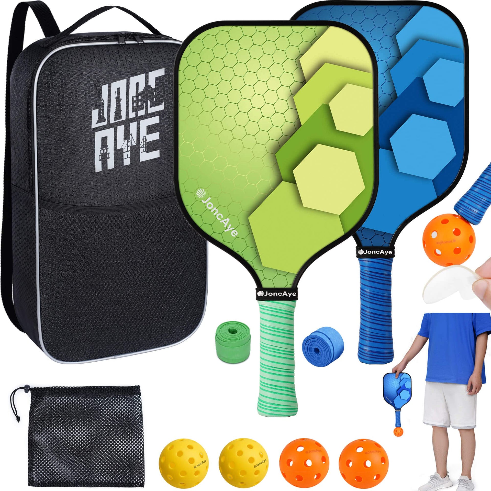Why JoncAye Pickleball Paddles and Balls  1) All JoncAye pickleball equipment is professionally designed by USAPA standards Our pickle ball raquette provides an unbeatable balance between lightweight and power They suit players of all levels especially beginners& intermediates 2) Both of our pickleball racquets and balls are made of premium material with state-of-the-art craftsmanship They are all built to last 3) JoncAye composite pickleball paddles are all constructed with a PP honeycomb core which produces a quieter sound than the Nomex core That makes this pickleball gear set a better choice for playing in communities with noise restrictions 4) We offer good after-sales service For any reason you donAt like this pickleball set, we offer a free replacement or refund within 30 days All JoncAye pickleball game sets are provided with a one-year warranty  Specifications: Paddle Surface: top-grade fiberglass Paddle core: PP  honeycomb construction Paddle Width: 8-18 inches Total Length: 15-12 inches Handle Length: 4-34 inches  grip Size: 4-14 inches Paddle Weight: 8 Oz Each Purchase Includes:  green Pickleball Paddles  x 1 Blue Pickleball Paddles x 1 carrying case x 1 Mesh Ball Bag x 1 Orange Pickleball Balls Indoor x 2 Yellow Pickleball Balls Outdoor x 2 Over-grips x 2 Ball Retrieving Stickers x 12