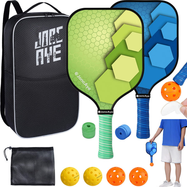- Q: What is included in the JoncAye Pickleball set? A: The set includes two pickleball paddles (one green and one blue), a carrying case, a mesh ball bag, four pickleball balls (two for indoor play and two for outdoor), two over-grips, and twelve ball retrieving stickers.