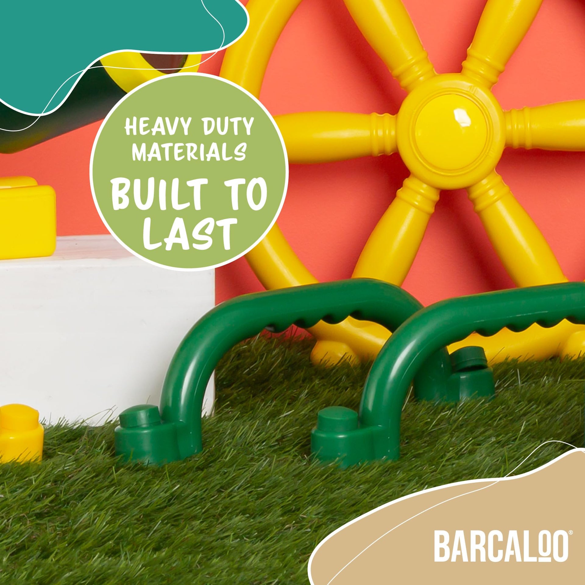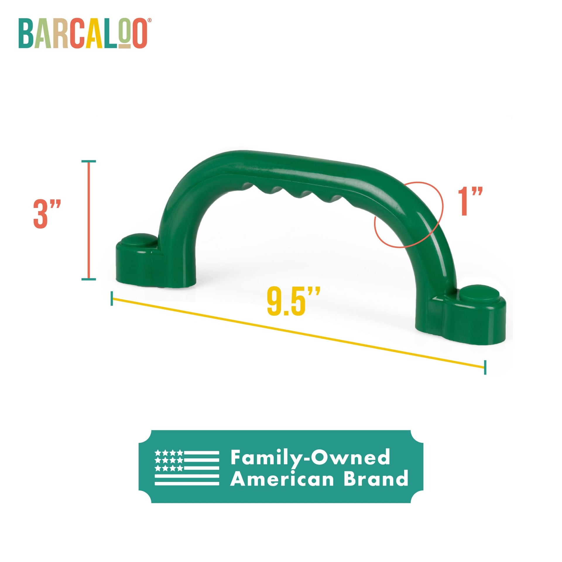 PROVIDES ADDITIONAL SAFETY - Playground handles help keep kids safe as they play, climb, and get great exercise on their monkey bars and playsets! QUICK & EASY INSTALLATION - These accessories include free hardware for fast installation on your backyard tree house, swingset, BUILT TO LAST - Heavy duty material and a strong, durable parts design ensure these playground handle bars will last you and your family for years. CERTIFIED SAFE - These playground grab handles meet or exceed all ASTM safety standards. 220 lb weight capacity. INCLUDES two green safety handles, four screw covers, and hardware. REPLACEMENT WARRANTY - Barcaloo stands behind all of its outdoor playground equipment 100%. These Jungle Gym Handles comes with an automatic 1 year warranty. Register online for a FREE TWO YEAR WARRANTY. 9.5 x 3 inches. 1 inch thick. DESIGNED FOR RESIDENTIAL USE ONLY: Not intended for commercial grade use. monkey backyard tree house accessories playset parts toys