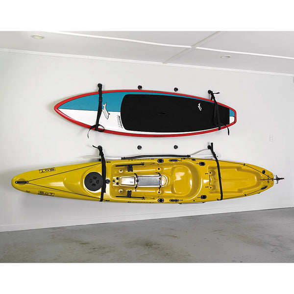 - Q: What types of watercraft can be stored with the RAILBLAZA Kayak Wall Mount Sling? A: The RAILBLAZA Kayak Wall Mount Sling is designed to store a wide range of watercrafts, including stand-up paddleboards (SUPs), canoes, windsurfers, and kayaks.