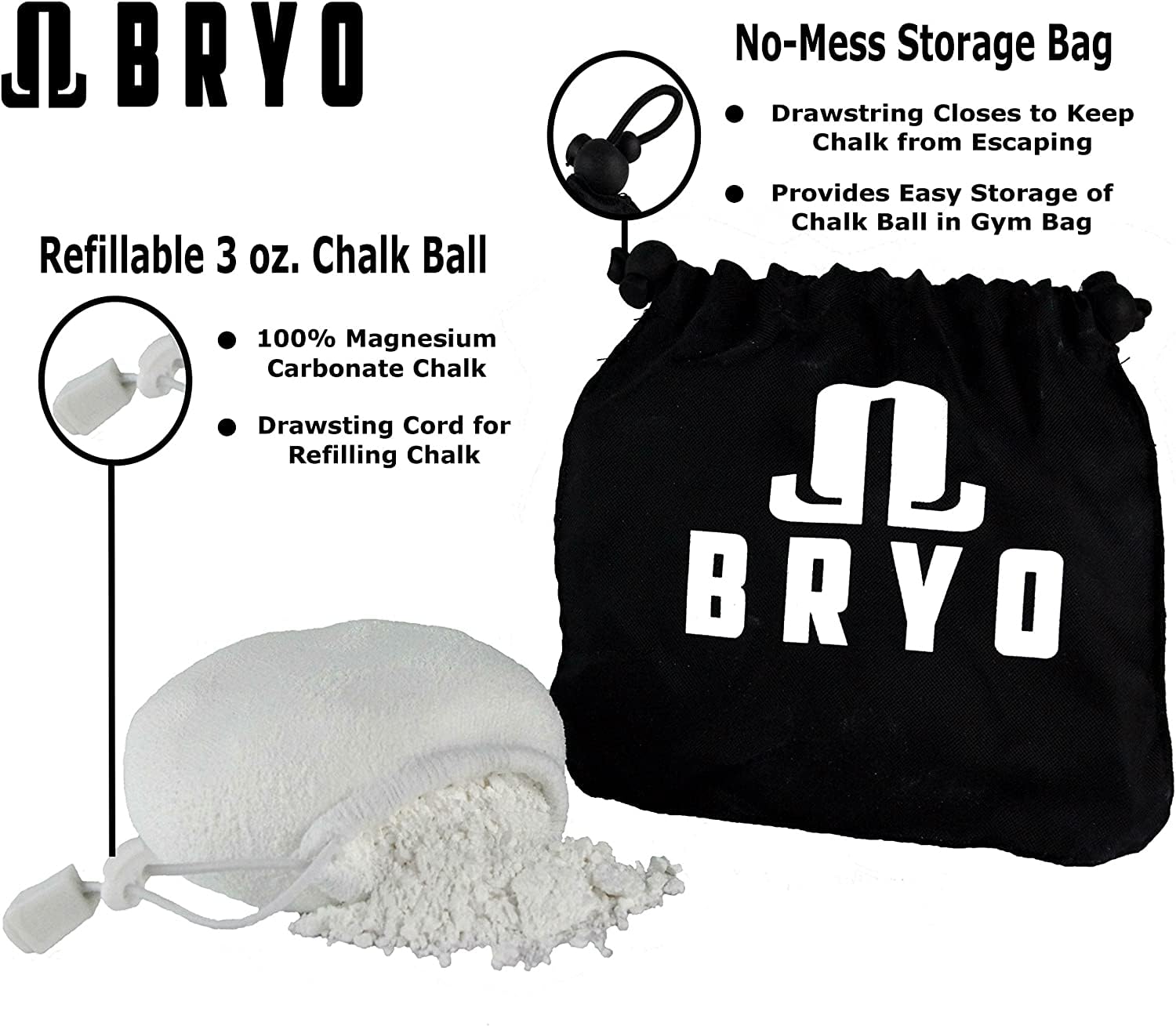 The BRYO gym grip powder is made out of materials that allow the perfect amount of chalk to be released onto your hands without over-applying Our chalk powder sock provides better quality for individuals who are serious about training and getting into shape This chalk climbing bag boasts durable construction, designed with enhanced features and comfortable, quality materials to offer optimal support and protection for even the most vigorous workouts HOW TO REFILL OUR REUSABLE cHALK BALLS Slide the convenient push-button closure away from the pouch to open the pouch Use a tablespoon or scooper to fill the pouch to your level of density Slide the closure back toward the pouch to close it up tightly