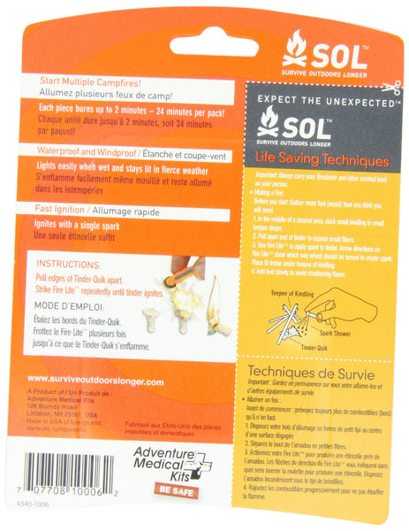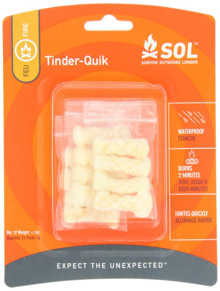 With its waterproof and windproof design, Tinder Quik is dependable tinder for starting a fire in any situation, from overnight hikes to survival emergencies. Pack Tinder Quik with your survival gear or bring it camping so you can confidently light campfires. Compact and ultra-lightweight, each piece burns for up to 3 minutes even when wet, providing you with plenty of time to start a fire without taking up extra space or adding unnecessary weight to your pack. This convenient 12-pack can be used alone or as refills for Survive Outdoors Longer kits like the Fire Lite Kit and Scout.
