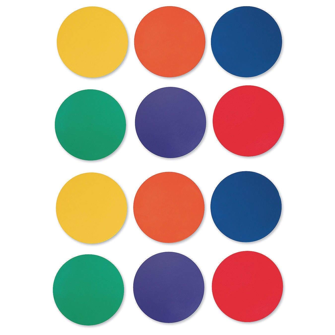 These 5A-diameter circle poly markers have always been an integral part of P E programs Washable and slip-resistant Molded from a highly flexible vinyl plastic Includes 2 of each of the 6 Spectrum colors: Red, yellow, blue, green, orange, and purple