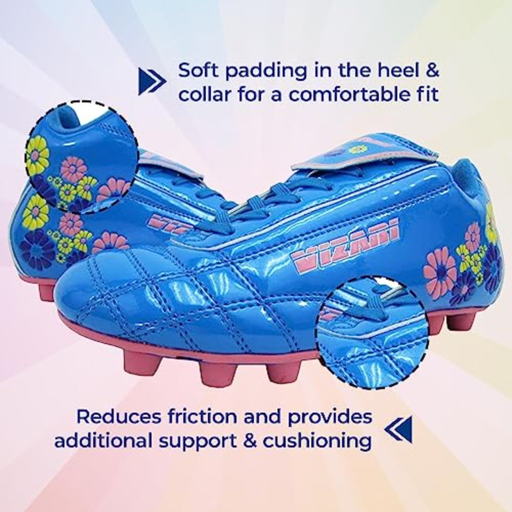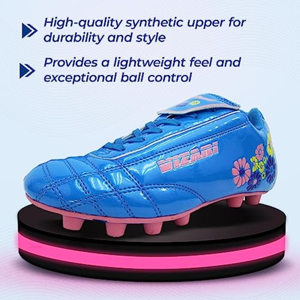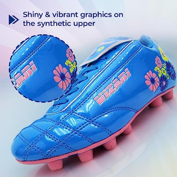 Ans: The upper of the Vizari Blossom Firm Ground Soccer Shoes features unique flower graphics on a durable, synthetic leather.