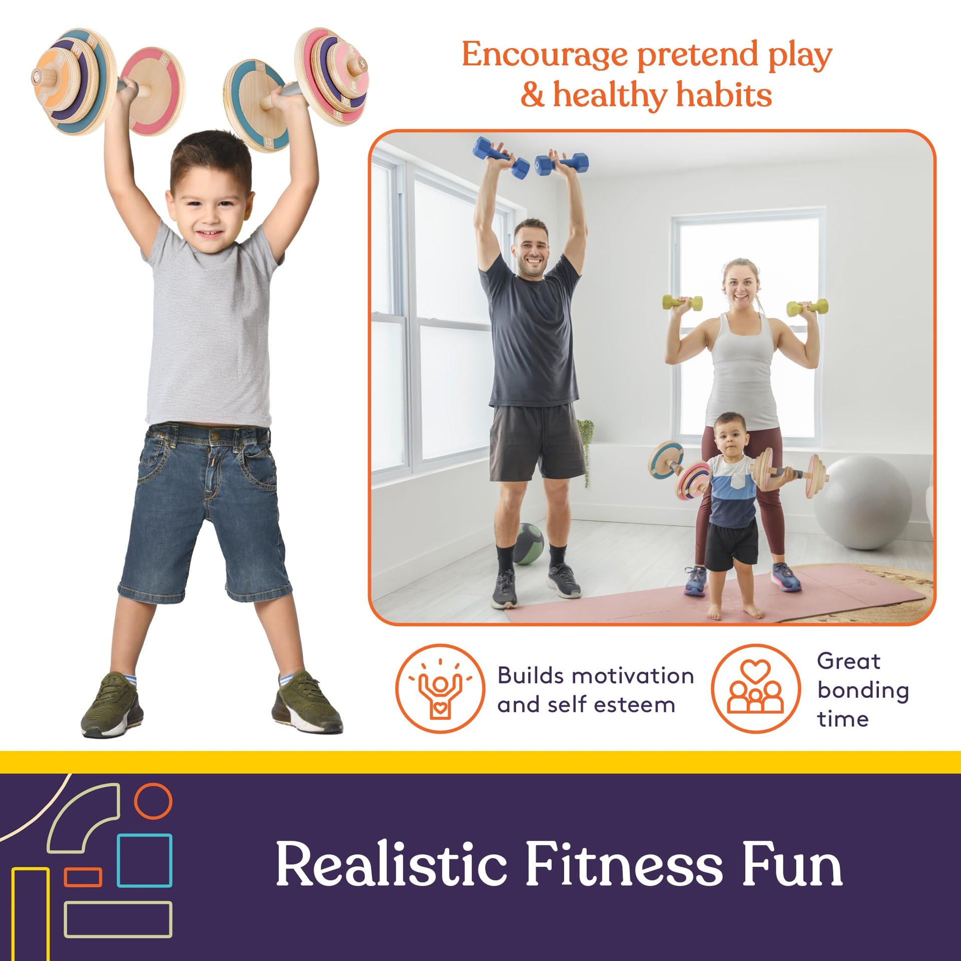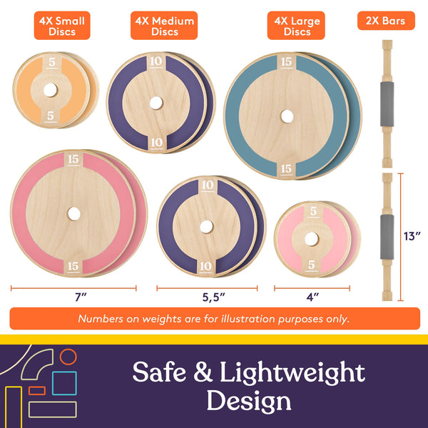 The Special Supplies Kids Wooden Workout Weights are a premium exercise equipment set designed specifically for children. This exceptional kids dumbbells set is an ideal addition to any kids' gym, providing a fun and engaging way for children to stay active and develop healthy habits. Designed with safety and versatility in mind, our workout equipment for kids is perfect for young fitness enthusiasts eager to explore the world of exercise. The youth weight set is both durable and lightweight, crafted from high-quality wood with a comfortable grip, making it easy for little hands to handle. The adjustable dumbbells set of 2 allows for customization in weight, ensuring that as your child grows, the weights can be adjusted to match their increasing strength. This adaptability makes it an ideal choice for a weight set for home gym use, as well as an excellent option for a school gym. Our weights for kids are specially designed for ages 3-12, providing a safe and enjoyable way for children to engage in strength training. Product Features: Includes 2 dumbbell bars, with 4 large discs, 4 medium discs, and 4 small discs Dumbbell Measurements: 12 x 13 inches Recommended for ages 3 to 12 years old Soft, Engaging Pastel Colors Helps kids develop their muscles and strength Non-toxic and safe for kids Natural Montessori Style Wood The Special Supplies Kids Wooden Workout Weights are not only an excellent addition to any weight set for kids but also a valuable tool for promoting physical activity and healthy lifestyles. Whether used at home during family fitness sessions, or in a school setting, this kids' dumbbell weight set provides endless opportunities for fun and fitness. Embrace the joy of exercise with this exceptional kids workout set, designed to inspire and motivate the next generation of fitness enthusiasts.