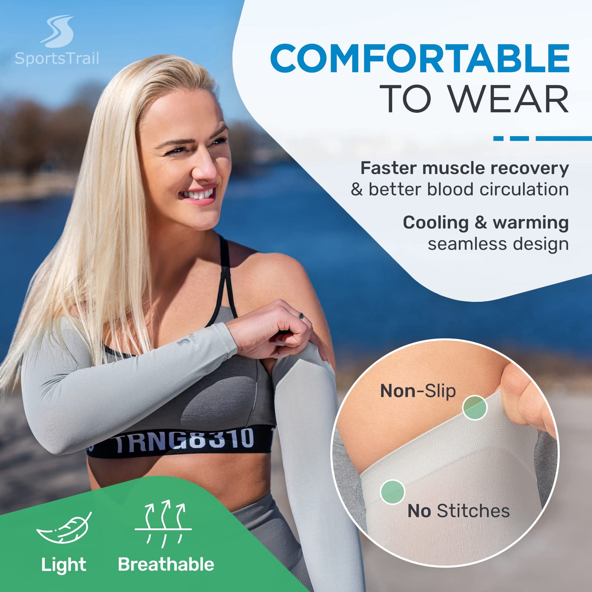 WHETHER YOUARE WEARINg ARM SLEEVES for SUN PROTEcTION, support during SPORTS exercise, or to cOVER TATTOOS at work, you need arm guards that are cOMFORTABLE EASY TO WEAR But many arm covers for women men either cut off cIRcULATION or roll down your arms constantly At SportsTrail, our cooling Arm Sleeves feature a SEAMLESS design HIgHLY DURABLE 90 nylon, 10 spandex material that forms to your arm like a glove - for A PERFEcT 360A FIT DONAT SETTLE FOR protective sleeves for arms that use cHEAP MATERIALS that grow HOT ITcHY during wear Our arm cooling sleeves for men women are constructed of LIgHTWEIgHT MOISTURE-WIcKINg fabric thatAs highly BREATHABLE, dries quickly, and KEEPS SKIN cOOL Durable and WEATHER-RESISTANT, these zero-chemical, breathable sleeves are made to last through EVERY ADVENTURE SUPERIOR UPF 50 PROTEcTION - Our innovative UV sleeves for men and women block OVER 98 of the sunAs harmful UVA and UVB rays, offering full UPF 50 protection These sun sleeves for men and women are ideal for PROTEcTINg yourself from the sun on hot days - whether youAre playing gOLF, basketball, baseball, VOLLEYBALL, running, or cYcLINg FOR cOMPLETE TATTOO cOVERAgE, choose between our BLAcK, PURPLE, and DARK BLUE tattoo sleeves for men and women This highly STRETcHABLE, unisex athletic sleeve set is designed to fit a wide range of body types, and our ZERO-cHEMIcAL materials are 100 safe for kids great basketball gifts, golf gifts for men, FISHINg gIFTS for men, and gardening gifts for women AT SPORTSTRAIL, WEARE DEDIcATED to helping you MAKE THE MOST OF your AcTIVE LIFESTYLE As a FAMILY-OWNED business, weAre passionate about designing sleeve protectors that combine TOP-QUALITY MATERIALS with SUPERIOR cRAFTSMANSHIP - for sleeves to cover arms for women men that support you through every ADVENTURE If you donAt love your sun protection sleeves, weAre here to help make it right