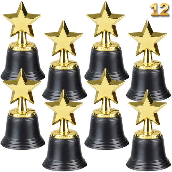 Award Winning Trophies Each Bedwina pack of star shaped trophies in bulk includes 12 - 45 Inch tall plastic star trophies with a beautiful gold glossy finish With these Bedwina gold award trophy cups the possibilities are endless convenient and great for party favors and to show appreciation to your kids The large black base is ideal for making a homemade nameplate Star Struck - Spectacular-Looking Trophies and AwardsWith our golden star trophies everyone is a winner challenge everyone to have a great time at your party and give them the recognition and acknowledgement they deserve with these star studded trophies and awards High Quality - Sturdy Durable Plastic These trophies for kids are made from high quality non-toxic plastic and individually wrapped Each cup is secured to its base is well packaged and individually wrapped with care so they arrive safely Recommended for ages 3 and up KEY FEATURES: Pack of 12 gold Star Shaped Trophies 45-Inches Tall great for Party Favors, Awards, games, Achievements Metallic gold Finish Black Bases Made from Non-Toxic Plastic High Quality Individually Wrapped Recommended Ages 3+ click Add to cart to order your star shaped mini trophies 12 pack Today