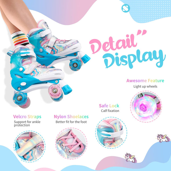 ?SUITABLE SKATE SIZE -- Please choose the proper size by measuring your kid's foot length ,size may vary among different brands. ?The size Small fits foot length between 6.7in and 7.5in ?The size Medium fits foot length between 7.8in and 8.6in ?The size Large fits foot length between 8.8in and 9.6in ?SPECIAL ILLUMINATING WHEELS -- All wheels illuminating, white lights inside the wheels with self-generating power. No battery needed. ?SAFE CLOSURE SYSTEM -- The cuff nylon buckle, power strap and lace closure system will help fasten the feet properly into the skate,providing your kid a safer condition when using our inline skates. ?DELICATE GIFT WRAPPING -- We use hard and delicate box to package the inline skate. You can choose it as a christmas gifts or a surprise,your kid will like it. ?Tips -- ?If your kid skate outdoor more often, please change the PU wheels to higher durometer,such as 85A. ?Wider feet,growing feet or half sizes please go up a size. ?Please check wheels and truck tightness and adjust as needed to use.