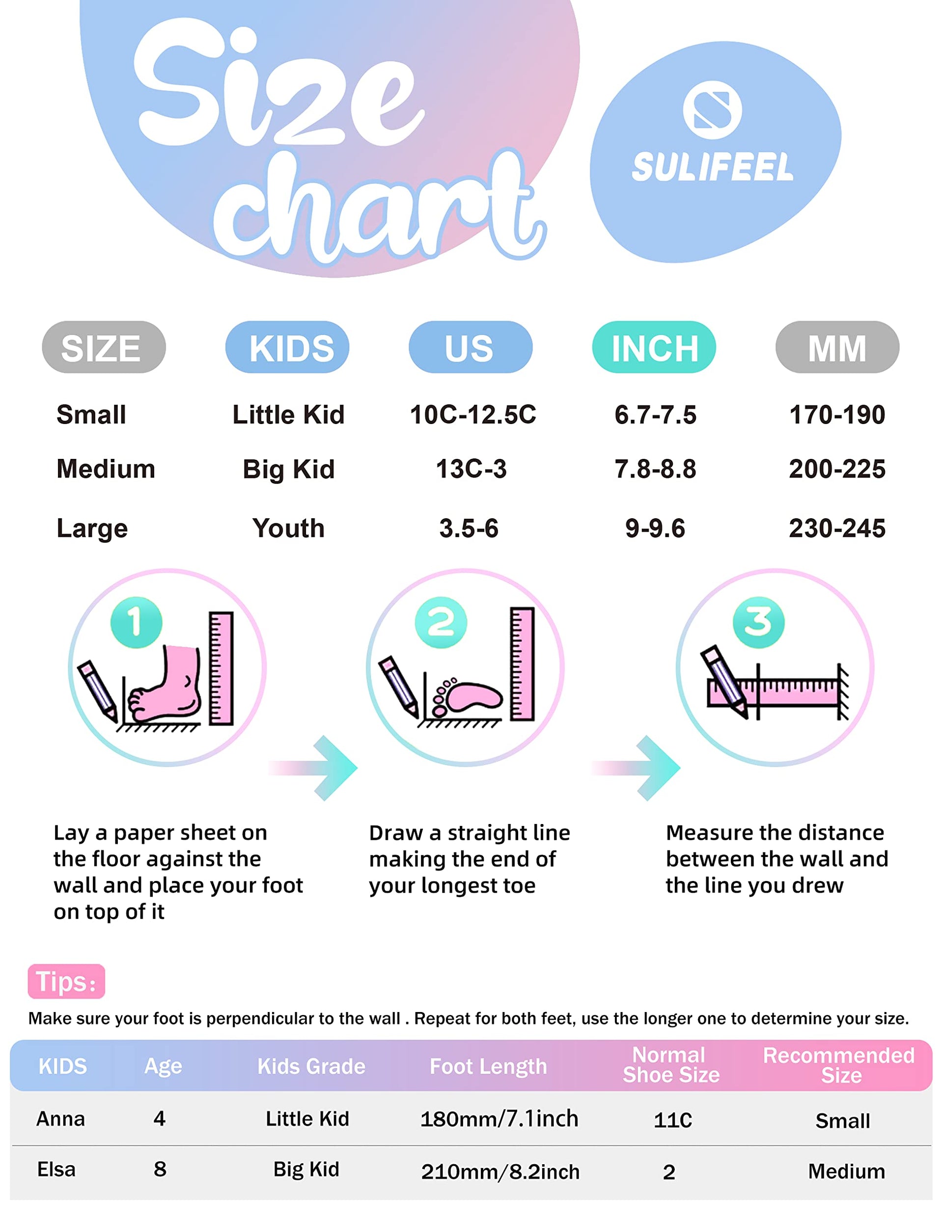 ?SUITABLE SKATE SIZE -- Please choose the proper size by measuring your kid's foot length ,size may vary among different brands. ?The size Small fits foot length between 6.7in and 7.5in ?The size Medium fits foot length between 7.8in and 8.6in ?The size Large fits foot length between 8.8in and 9.6in ?SPECIAL ILLUMINATING WHEELS -- All wheels illuminating, white lights inside the wheels with self-generating power. No battery needed. ?SAFE CLOSURE SYSTEM -- The cuff nylon buckle, power strap and lace closure system will help fasten the feet properly into the skate,providing your kid a safer condition when using our inline skates. ?DELICATE GIFT WRAPPING -- We use hard and delicate box to package the inline skate. You can choose it as a christmas gifts or a surprise,your kid will like it. ?Tips -- ?If your kid skate outdoor more often, please change the PU wheels to higher durometer,such as 85A. ?Wider feet,growing feet or half sizes please go up a size. ?Please check wheels and truck tightness and adjust as needed to use.