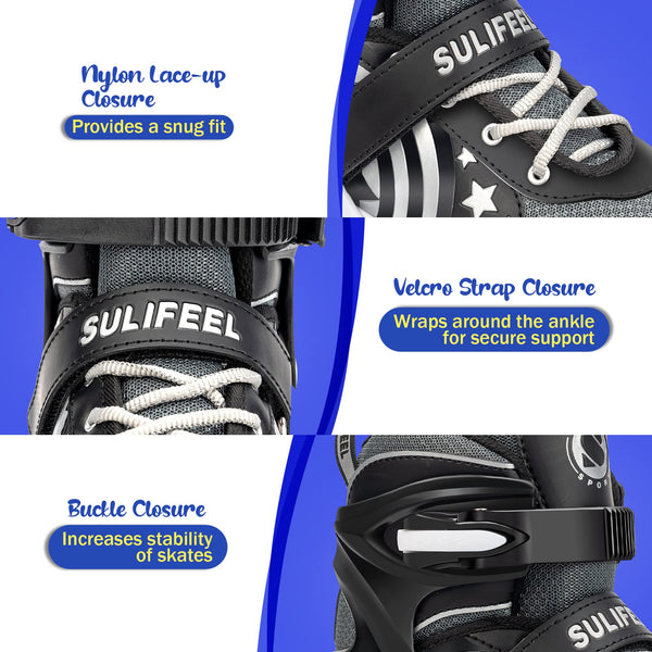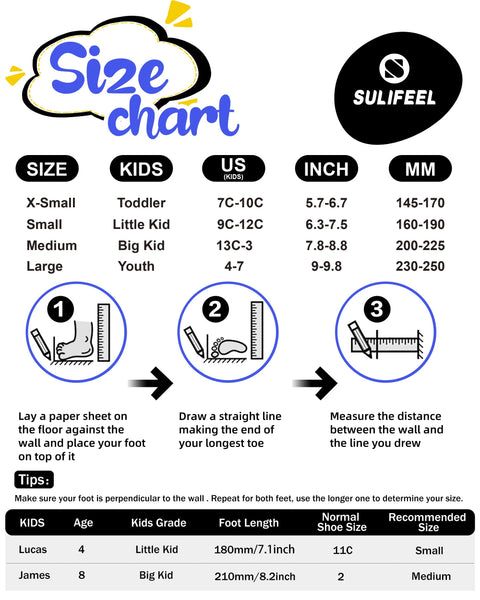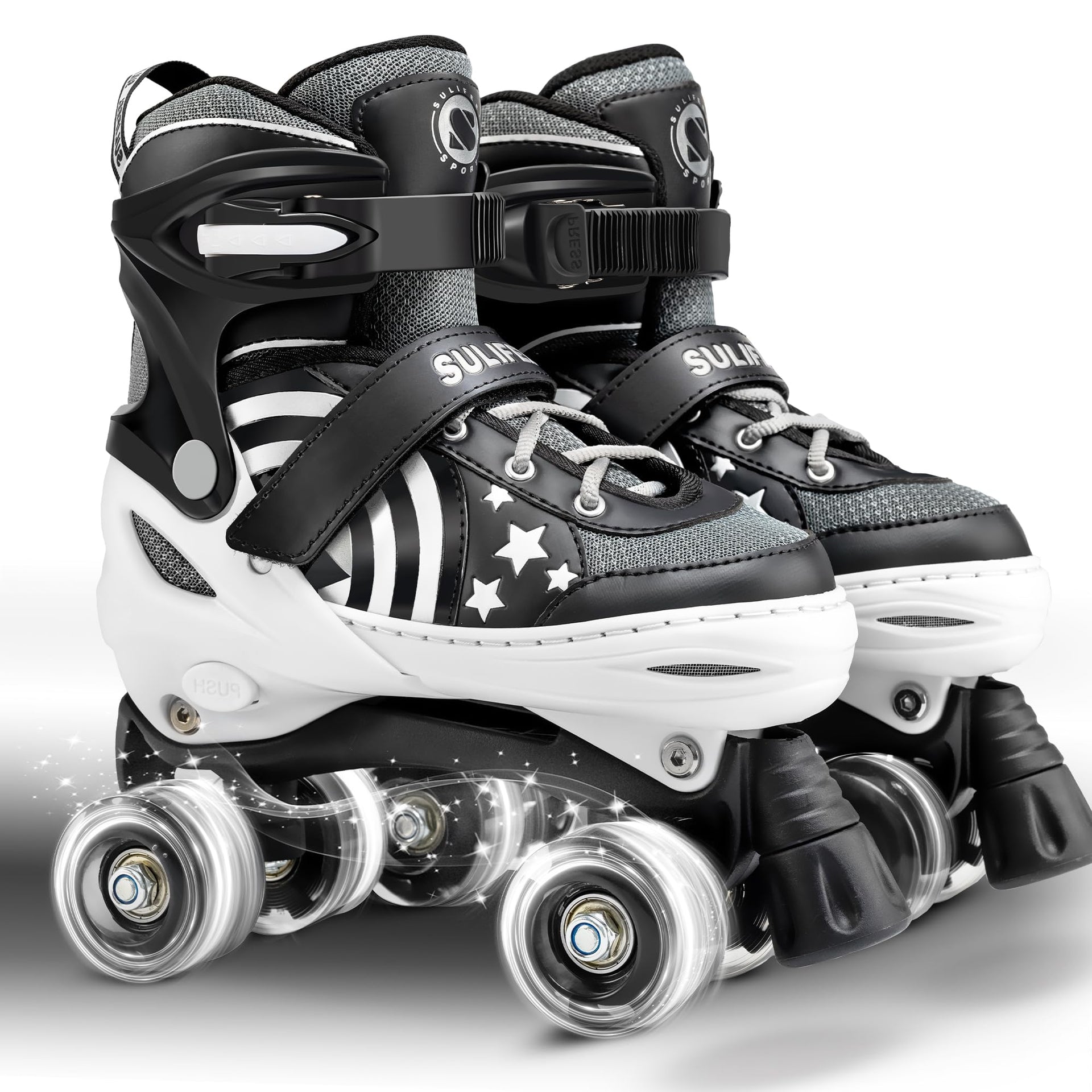 ?SUITABLE SKATE SIZE -- Please choose the proper size by measuring your kid's foot length ,size may vary among different brands. ?The size Small fits foot length between 7in and 8in ?The size Medium fits foot length between 8in and 9in ?The size Large fits foot length between 9in and 10in ?SPECIAL ILLUMINATING WHEELS -- All wheels illuminating, white lights inside the wheels with self-generating power. No battery needed. ?SAFE CLOSURE SYSTEM -- The cuff nylon buckle, power strap and lace closure system will help fasten the feet properly into the skate,providing your kid a safer condition when using our inline skates. ?DELICATE GIFT WRAPPING -- We use hard and delicate box to package the inline skate. You can choose it as a christmas gifts or a surprise,your kid will like it. ?Tips -- ?If your kid skate outdoor more often, please change the PU wheels to higher durometer,such as 85A. ?Wider feet,growing feet or half sizes please go up a size. ?Please check wheels and truck tightness and adjust as needed to use.