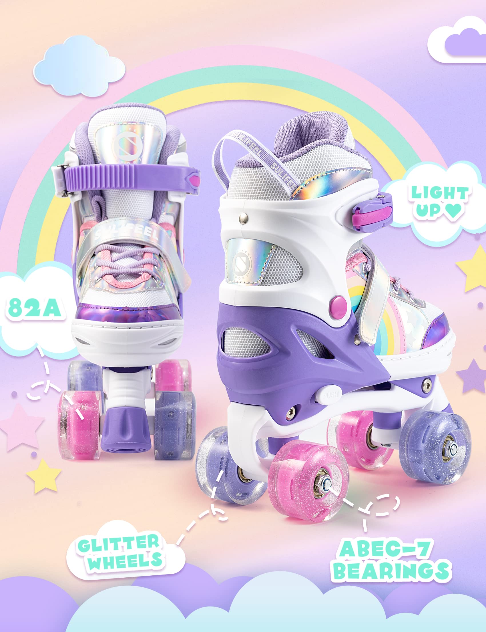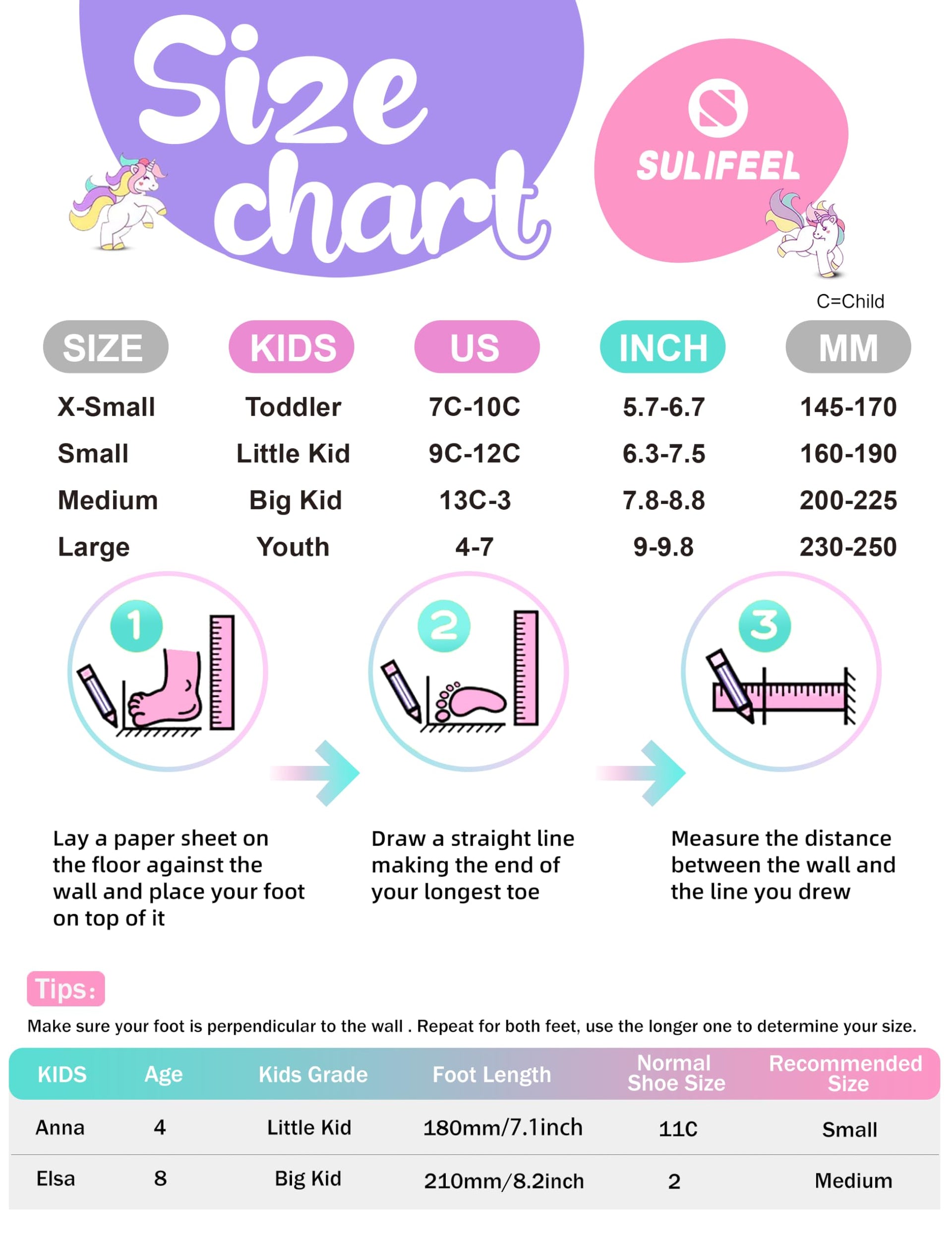 ?SUITABLE SKATE SIZE -- Please choose the proper size by measuring your kid's foot length ,size may vary among different brands. ?The size Small fits foot length between 6.7in and 7.5in ?The size Medium fits foot length between 7.8in and 8.6in ?The size Large fits foot length between 8.8in and 9.6in ?SPECIAL ILLUMINATING WHEELS -- All wheels illuminating, white lights inside the wheels with self-generating power. No battery needed. ?SAFE CLOSURE SYSTEM -- The cuff nylon buckle, power strap and lace closure system will help fasten the feet properly into the skate,providing your kid a safer condition when using our inline skates. ?DELICATE GIFT WRAPPING -- We use hard and delicate box to package the inline skate. You can choose it as a christmas gifts or a surprise,your kid will like it. ?Tips -- ?If your kid skate outdoor more often, please change the PU wheels to higher durometer,such as 85A. ?Wider feet,growing feet or half sizes please go up a size. ?Please check wheels and truck tightness and adjust as needed to use.
