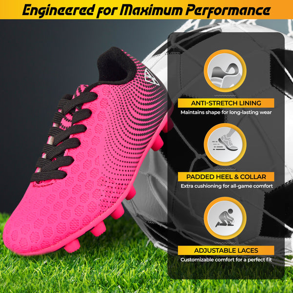 Lightweight, Durable, and Stylish -“?Elevate your soccer game with the Stealth Firm Ground Black and Pink Soccer Shoes ? the perfect blend of style and performance. Crafted with a polyurethane sole, these pink“?soccer cleats provide unparalleled comfort and enhanced traction on the field. The two-color textured synthetic upper ensures strength and durability, enhanced by an anti-stretch lining that maintains its shape over time. Step into excellence with these lightweight, durable, and stretch-resistant pink and black“? firm ground soccer shoes that cater to players of all levels.
