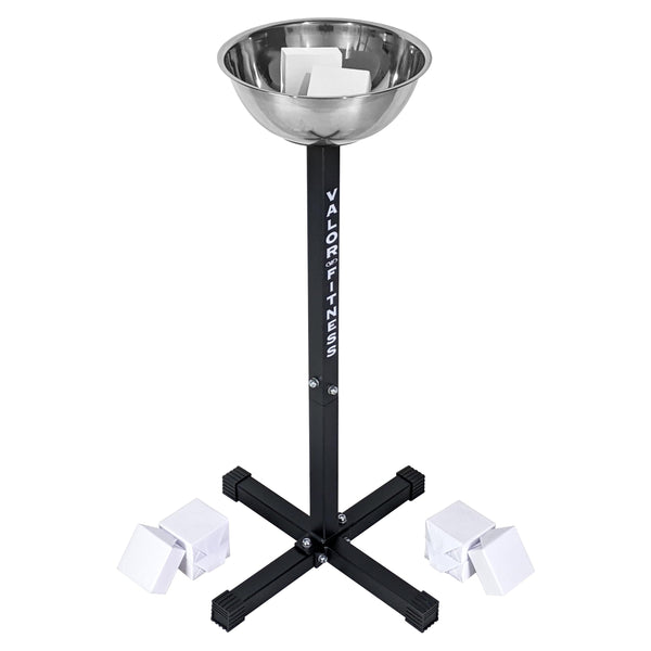 The Valor Fitness CH-1 chalk holder station is a freestanding chalk station for home or commercial gyms. Constructed of heavy-duty steel and designed with 4 legs to on the stand to prevent tipping in a buy home gym environment. This chalk holder reduces a mess by keeping the chalk in a 7deep, stainless-steel Bowl with a 23diameter to ensure that the chalk stays inside instead and off the floor. ?Lip on the outside of the bowl prevents a mess. the CH-1 chalk holder measures 40high, making it the perfect fit Your gym. Athletes will be more likely to use the chalk to enhance their performance If the Bowl is elevated instead of sitting on the floor. Simple changes make the experience of working out smoother and more enjoyable. Purchase includes 1 box of Valor Fitness CH-2 gym chalk which contains 8 blocks of 2 oz. Chalk bricks, each measuring 3. 5x 3. 5x 1. 75 Made of magnesium carbonate, CH-2 gym chalk can also be purchased separately on its own If additional boxes are needed.